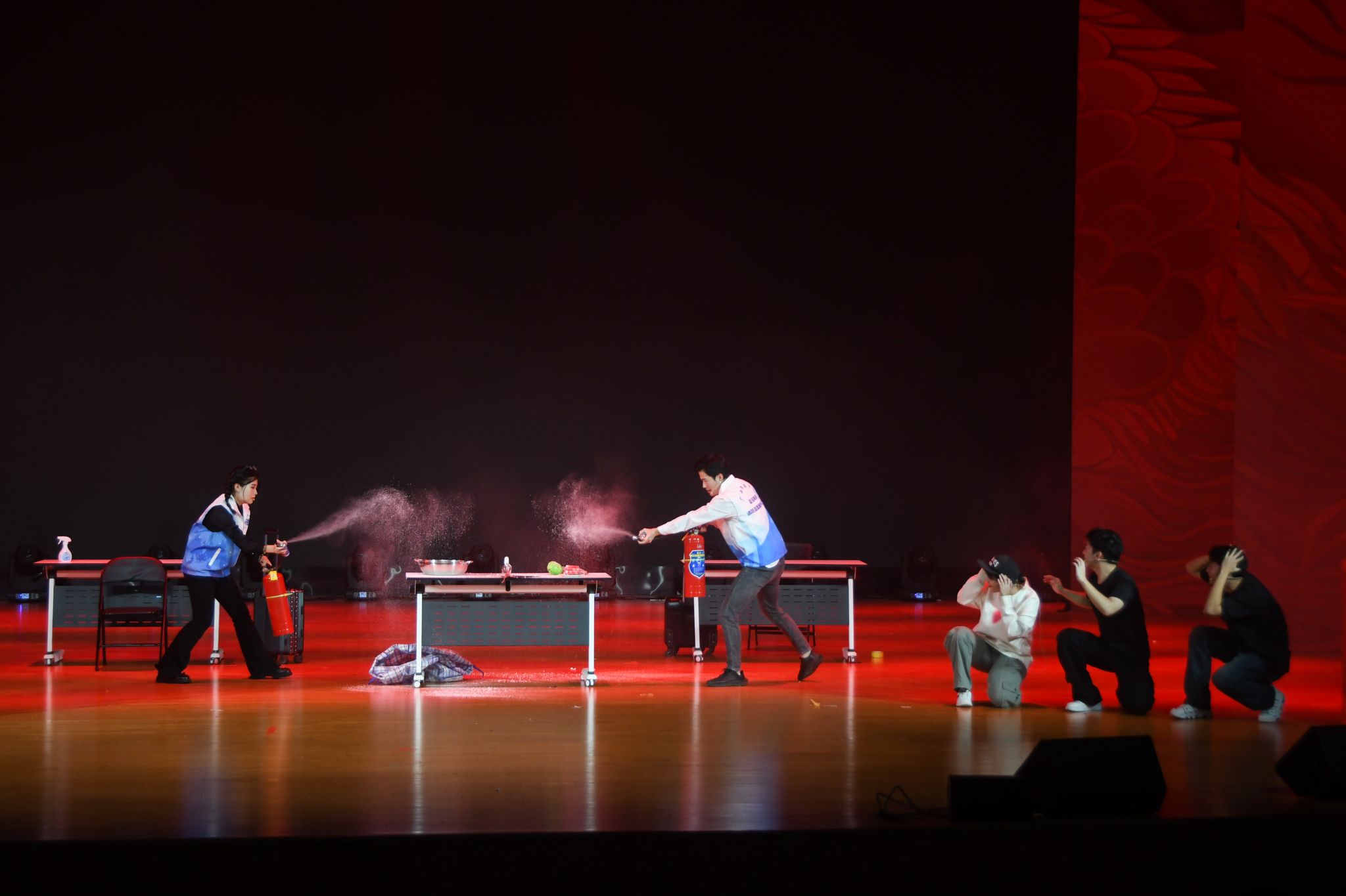 实干兴邦,踔厉奋斗。第二乐章“我们的奋斗”彰显新时代民大人笃行不怠、奋发向上的精神。器乐演奏《骆越情》极富层次感和表现力,古筝悠扬的音色勾勒出壮族先祖刀耕火种、繁衍生息的画面。小品《蓝焰小队》以生动幽默的表演风格向观众敲响校园消防安全的警钟。舞蹈《水娘钗》表演者舞姿婀娜轻盈,极具民族特色。歌曲《海耕谣》用变奏的手法将歌谣主题交替展现,层层推进,歌颂京族儿女坚韧不拔、自强不息的精神品质。我校驻东兰村第一书记和工作队队员代表带来的合唱《早安,阳光》,在振奋人心的和声中唱出扎根基层工作者的坚守与无私奉献,唱出新时代新征程上百姓生活的希望与期待。