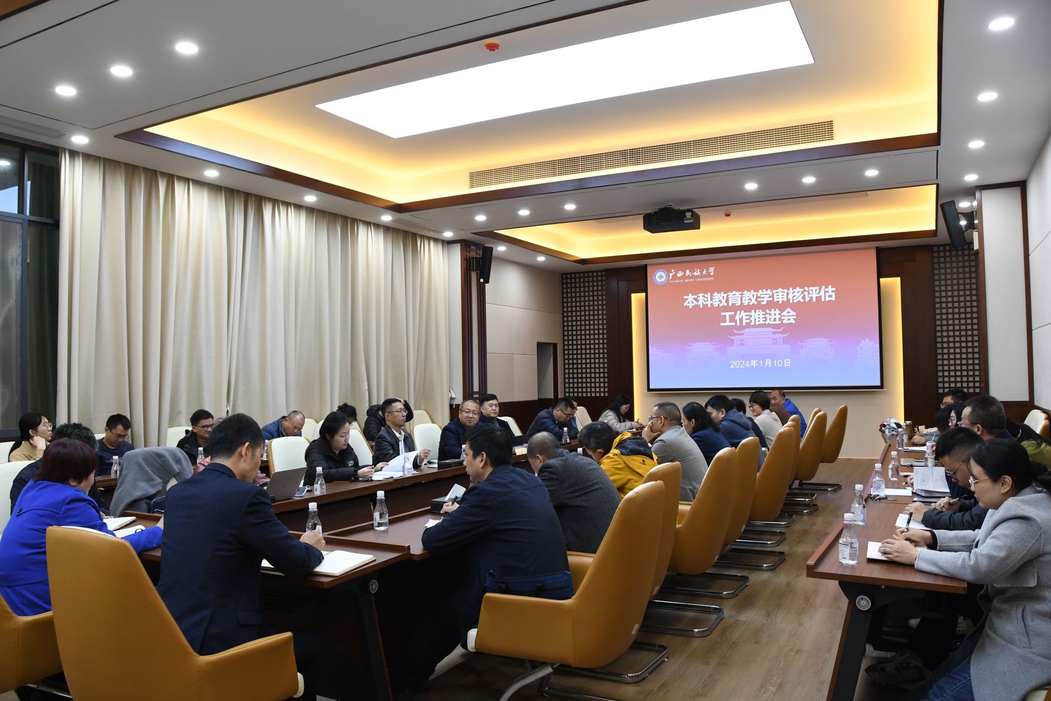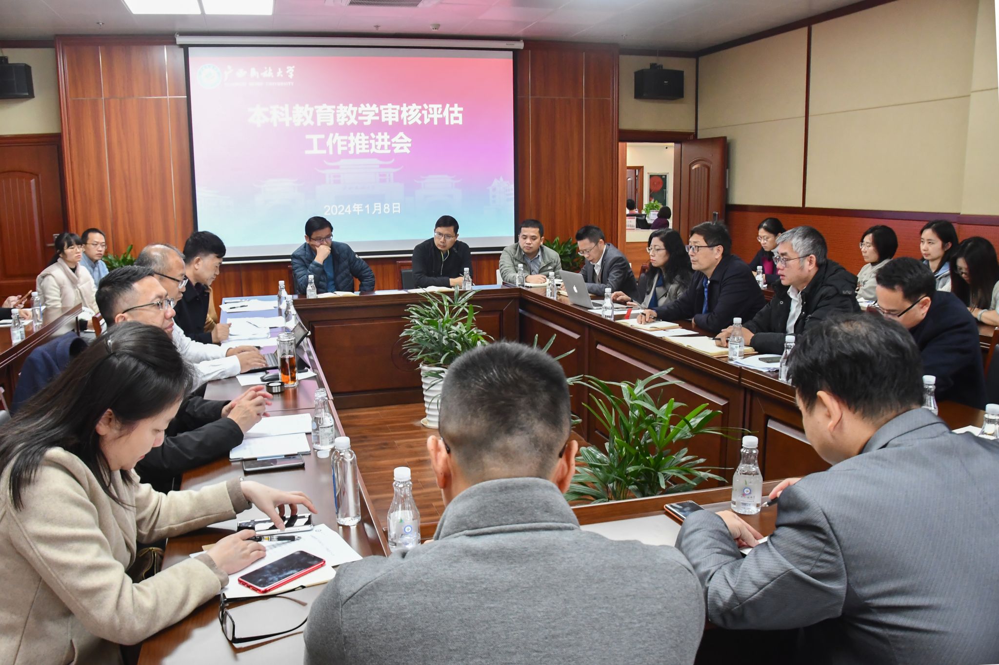【大学生通讯社报道】1月8日至12日,我校分别在武鸣校区、思源湖校区、相思湖校区召开本科教育教学审核评估工作推进会。党委常委、副校长、评估办主任姜明国出席会议。教务处处长、评估办副主任王新哲,各本科学院党委书记、院长、分管教学副院长、教学秘书,学校督查室领导,以及学校评估办全体人员参会。