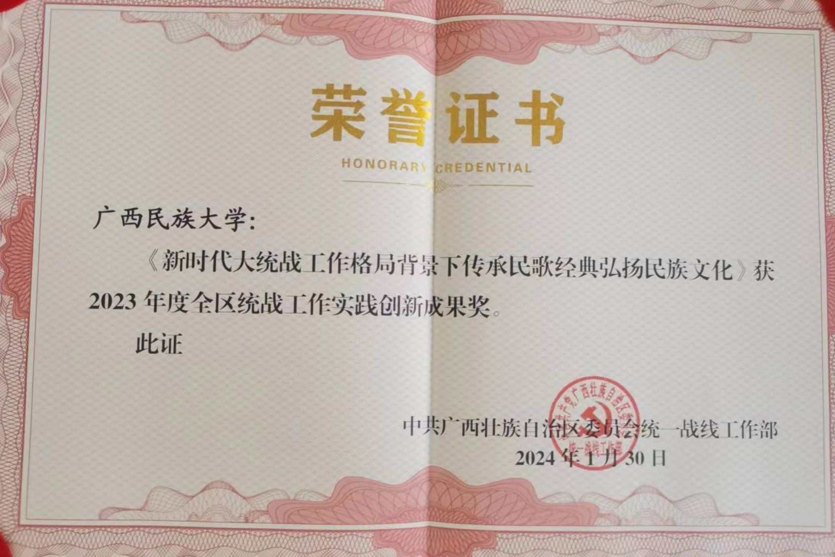 会议为获得2023年度全国、全区统战信息工作和统战理论政策研究、统战工作实践创新成果奖项的先进单位和个人颁发荣誉证书。taptap点点体育《新时代大统战工作格局背景下传承民歌经典弘扬民族文化》项目获全区统战工作实践创新成果奖。