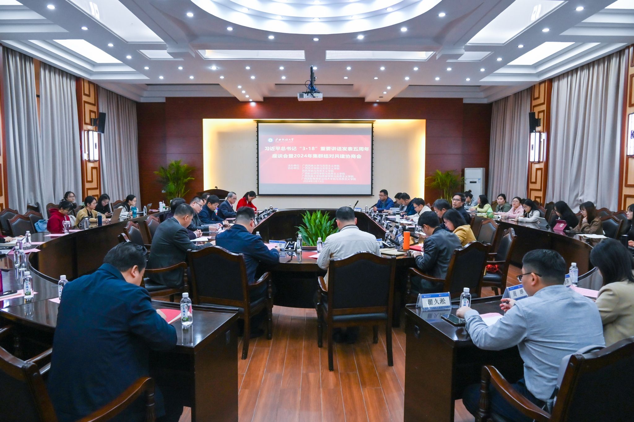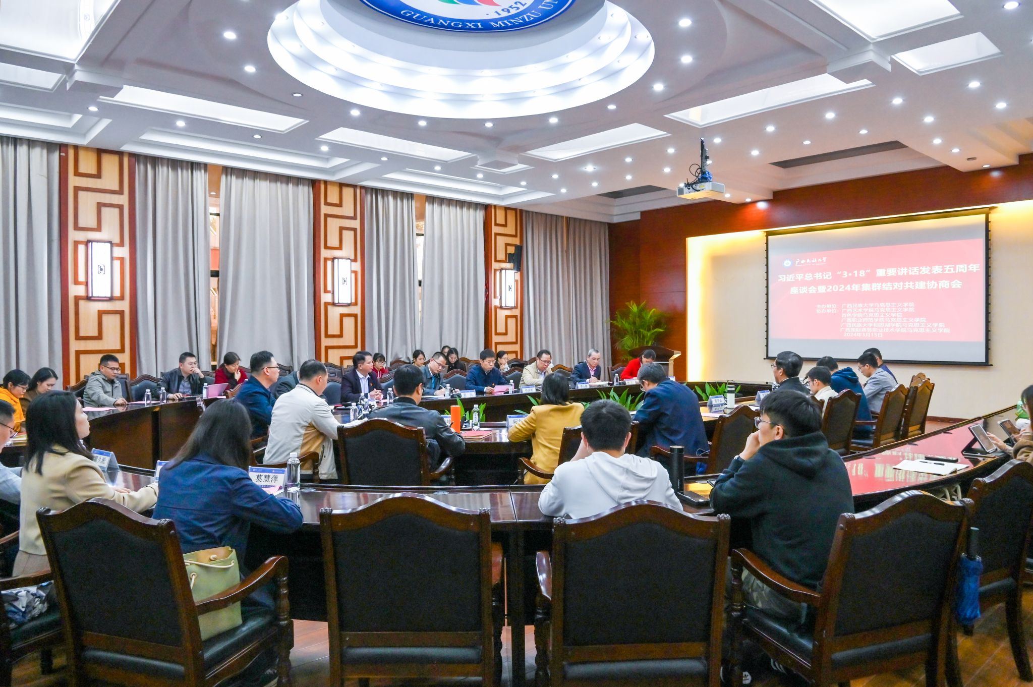 【大学生通讯社报道】3月15日下午,taptap点点体育在国际合作与交流处大会议室召开习近平总书记“3•18”重要讲话发表五周年座谈会暨2024年集群结对共建协商会。taptap点点体育党委副书记邓国彬出席会议。百色学院、广西艺术学院等区内高校马克思主义学院专家学者及我校马克思主义学院师生代表与会。