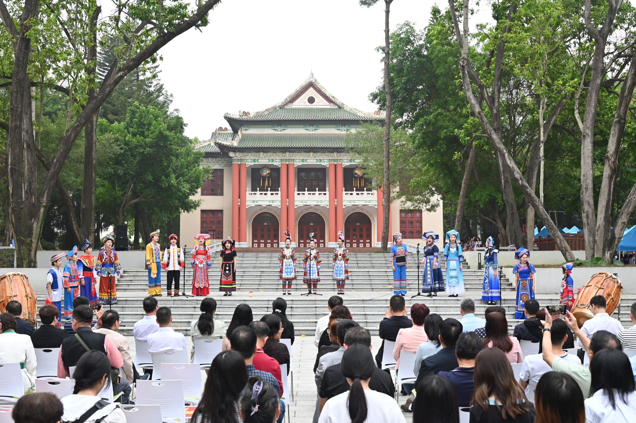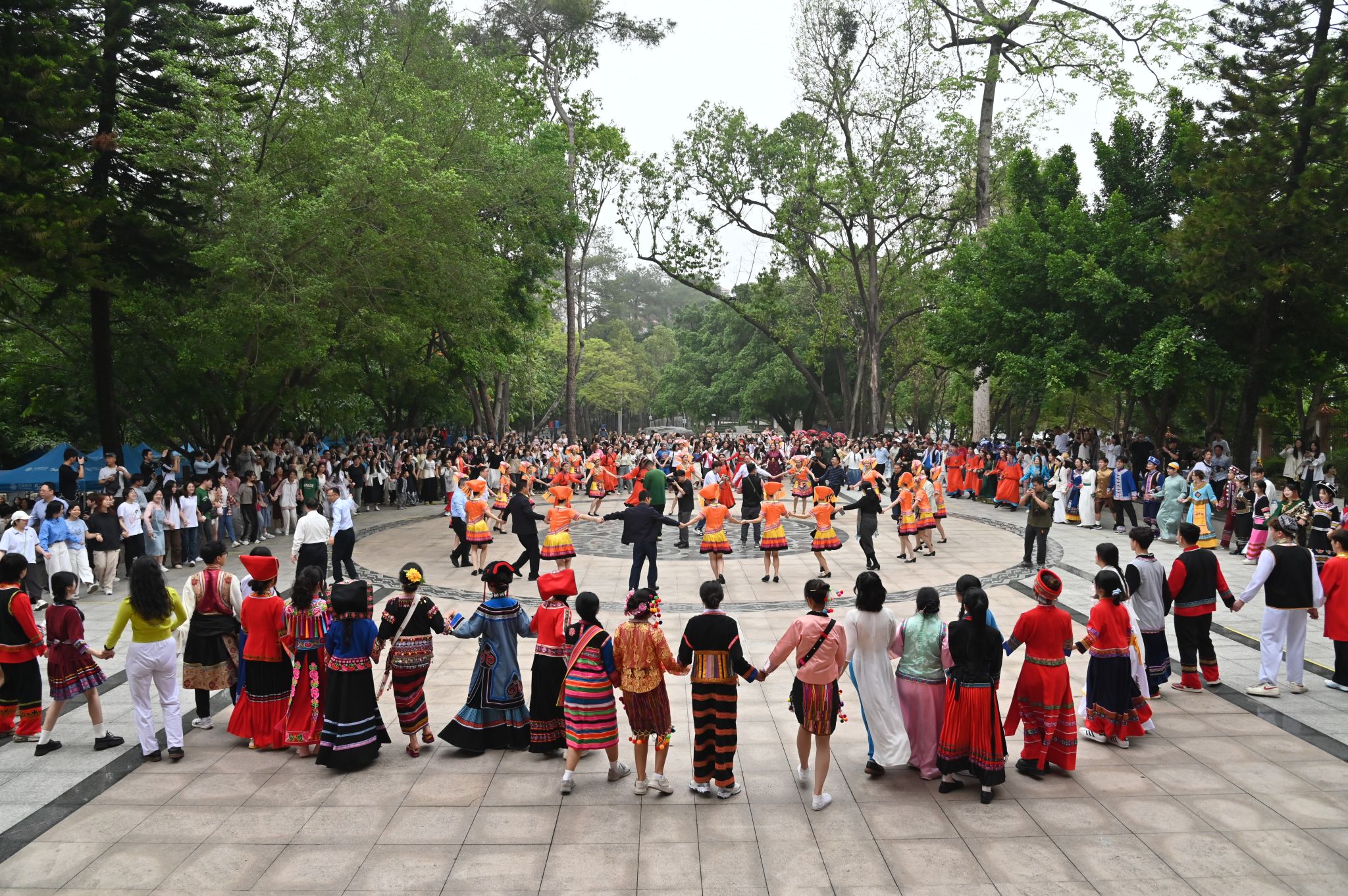 “五十六个民族,五十六枝花……”在富有感染力的歌声中,身着各民族服饰的表演者邀请台下师生走向广场中央,手拉着手围成大圆圈,载歌载舞,激起师生浓浓的民族自豪感和爱国情,展现出中华民族一家亲的生动场景。