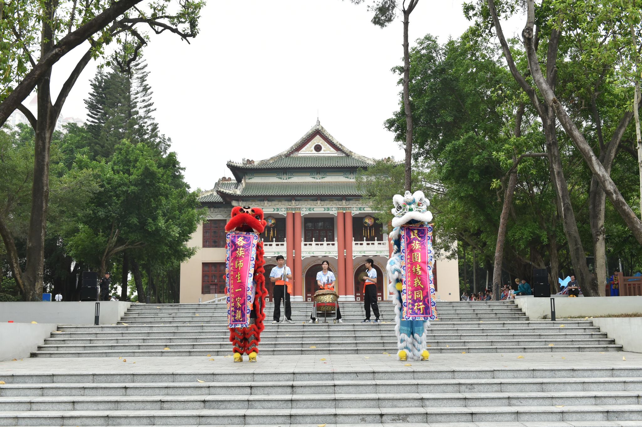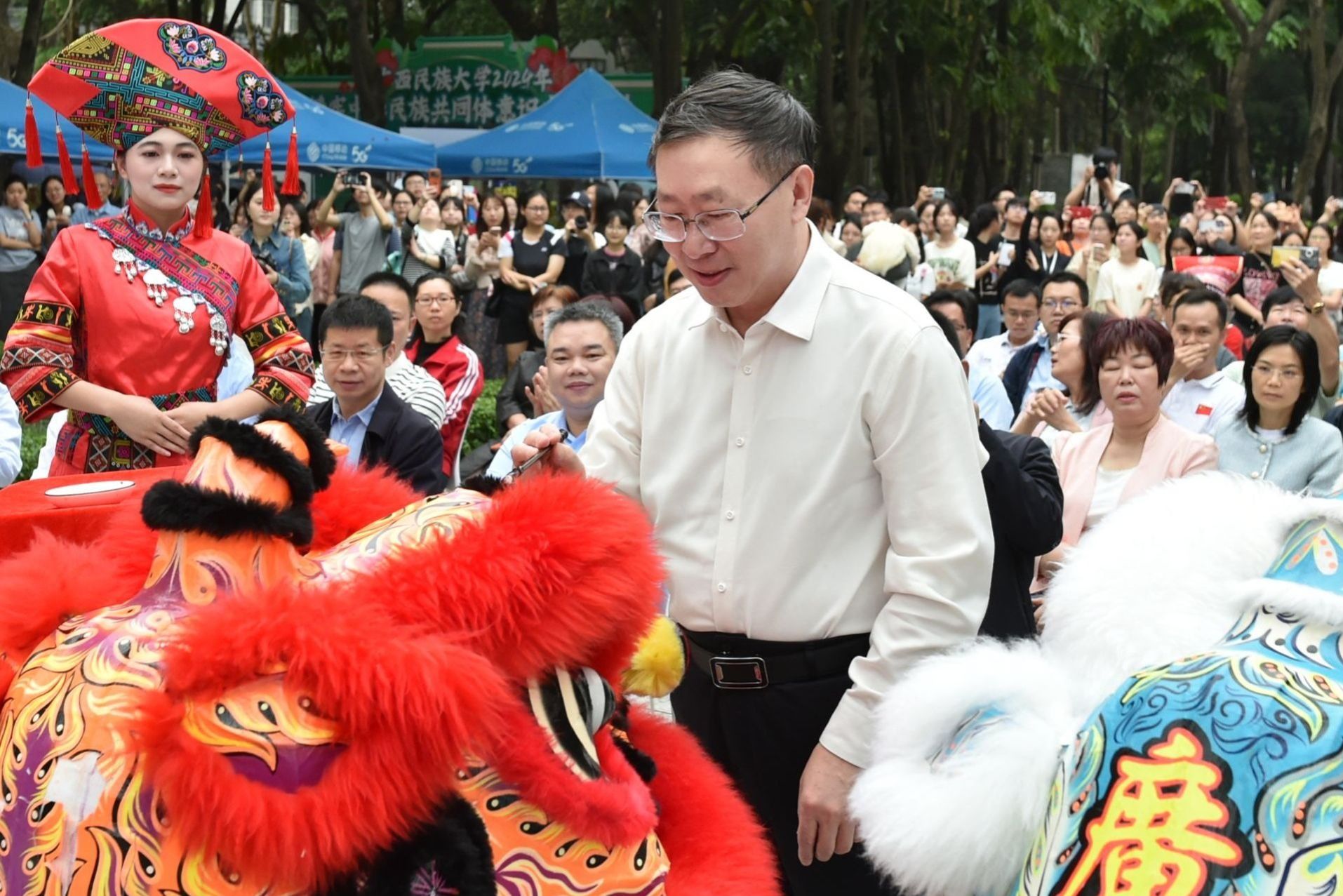 taptap点点体育党委书记卞成林,校长韦仕珍为迎宾双狮点睛,活动正式拉开帷幕。鼓点铿锵有力,两头狮子时而嬉戏打闹,时而摇头摆尾,时而翘首仰视,动作俏皮可爱。随着鼓声大震,狮口中的对联顺势展开——各族师生一家亲,民族团结我同行,现场迅速升温。
