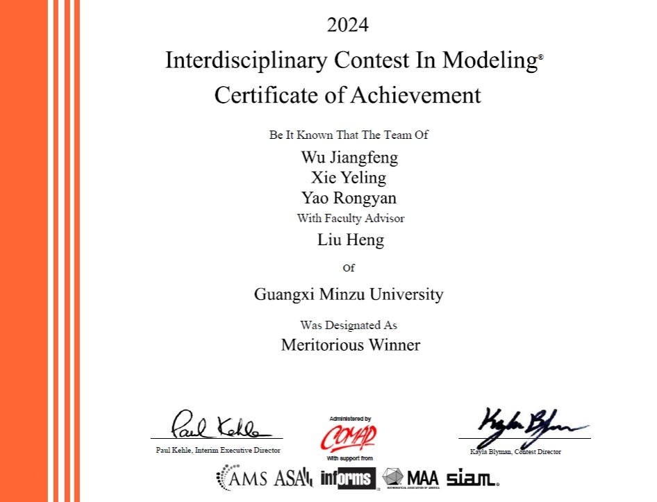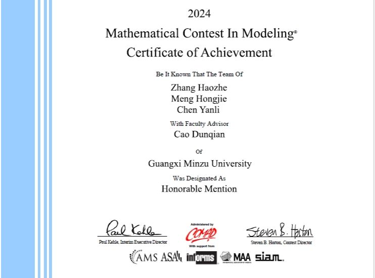 5月4日,2024年美国大学生数学建模竞赛和交叉学科建模竞赛成绩揭晓,taptap点点体育学子获得一等奖(Meritorious Winner)1项,二等奖(Honorable Mention)1项,分别是数学与物理学院刘恒老师指导,2021级数学与应用数学专业谢烨玲、姚荣艳、2022级数学与应用数学专业吴建峰组成的队伍和曹敦虔老师指导,2021级人工智能专业张皓哲、蒙宏杰、陈燕丽组成的队伍,这也是我校学子近五年第三次获得该项国际赛事的一等奖。