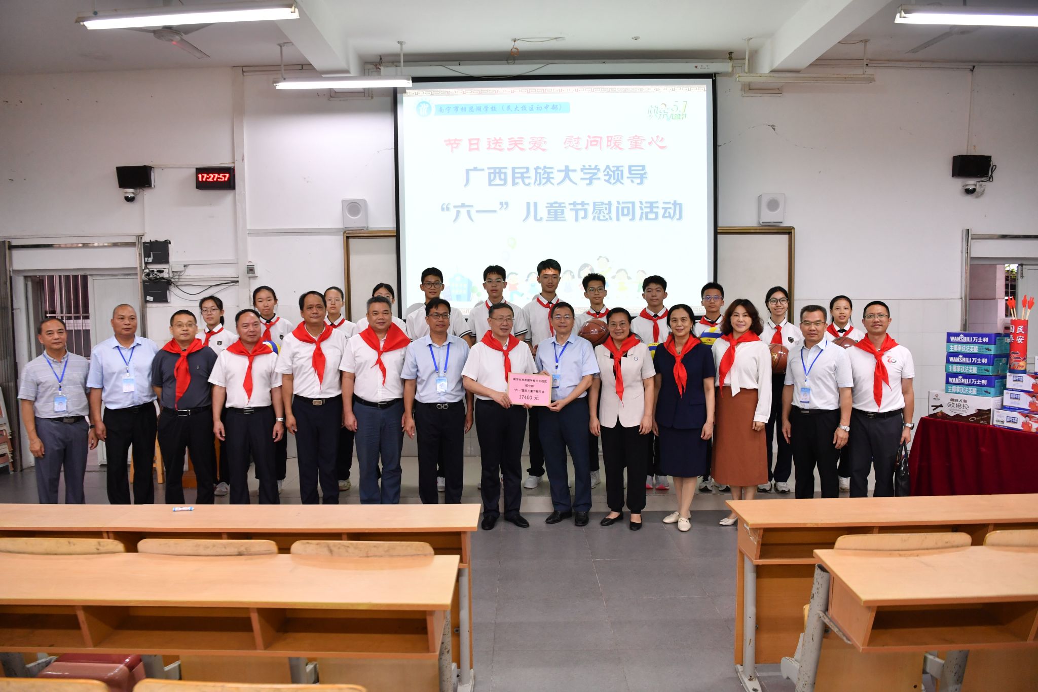 校领导代表学校向附属学校赠送节日慰问金和礼物。(初审:潘之铭 复审:荣子卿 终审:王文娟)
