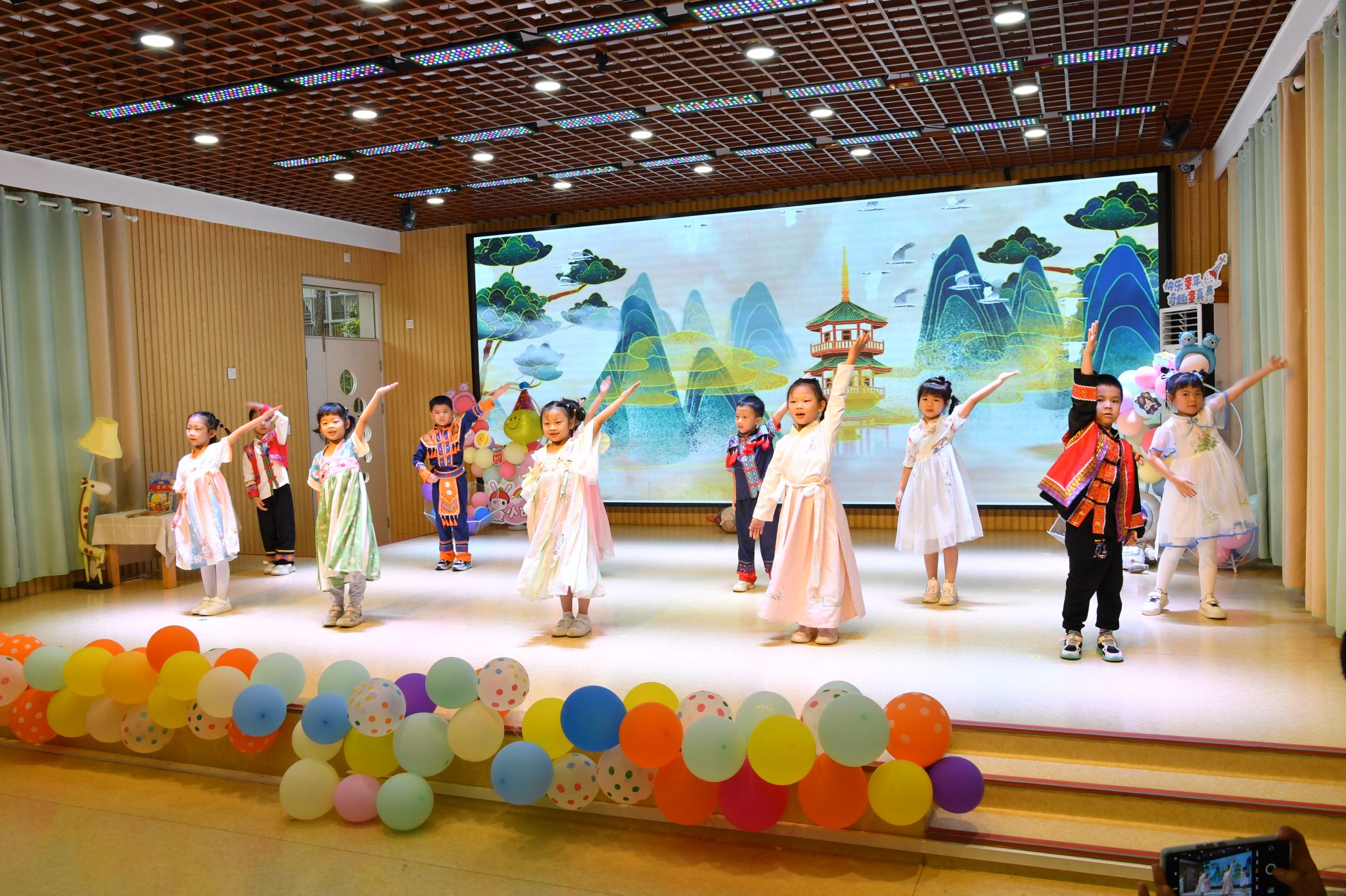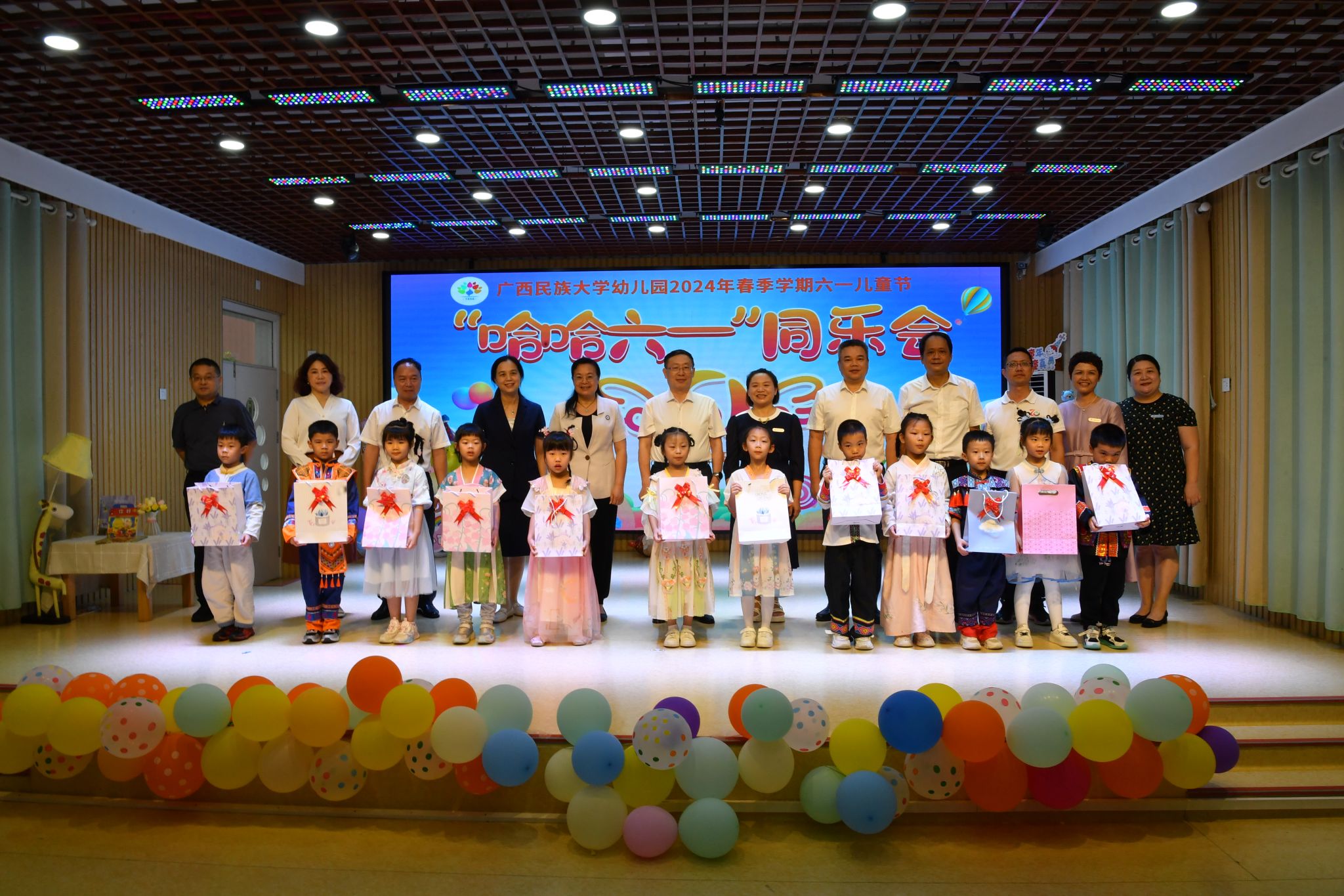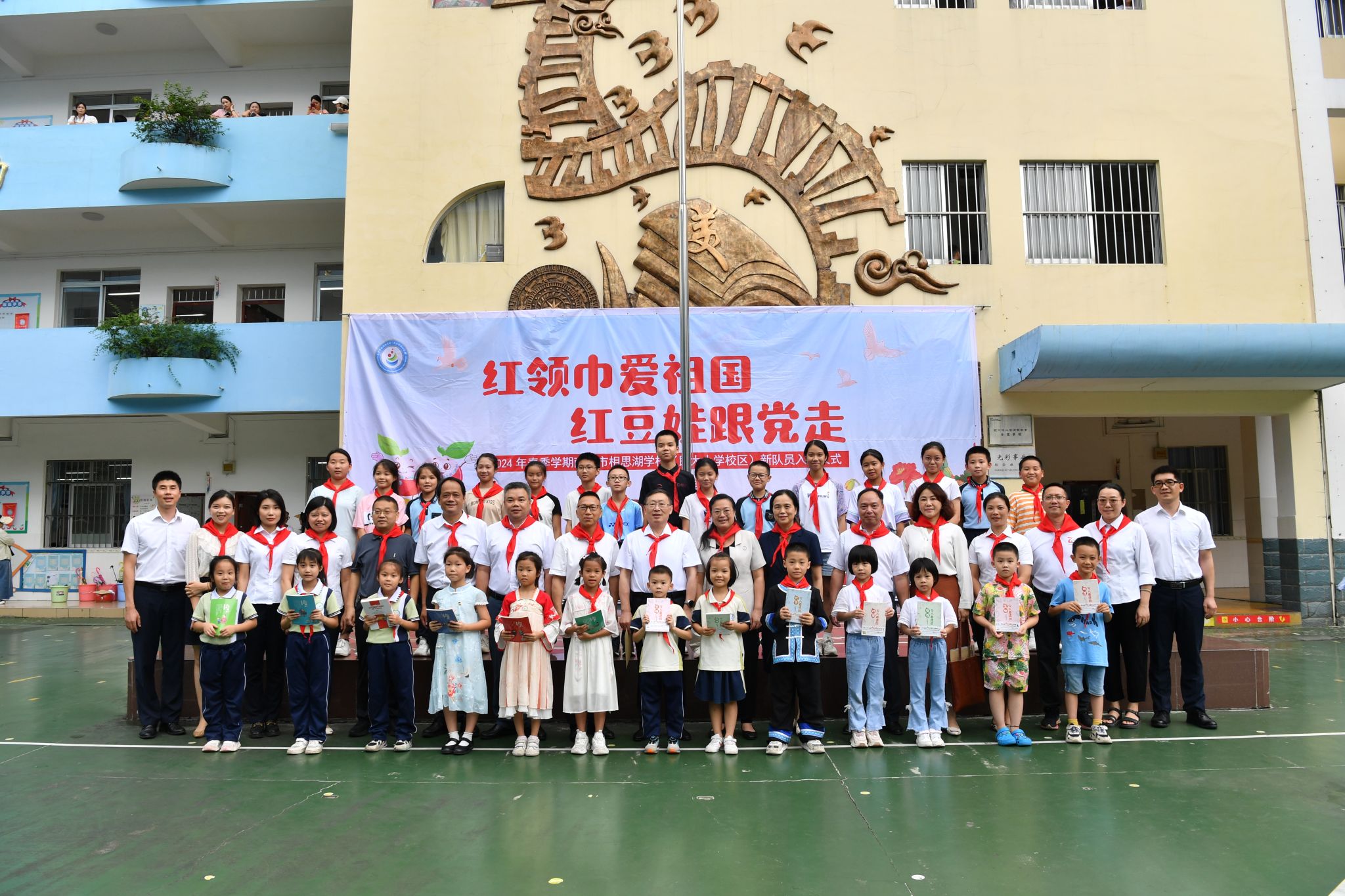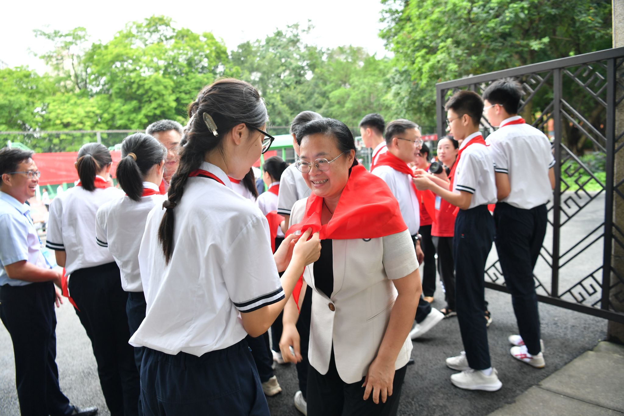 校园里洋溢着节日欢快的气氛。校领导一行观看孩子们为节日准备的歌舞表演,与儿童代表交流互动,赞扬孩子们朝气蓬勃、健康向上的精神风貌,并鼓励孩子们认真学习、加强锻炼,勇于创新,乐于奉献,争做新时代好少年。在小学部、初中部,孩子们为校领导一行佩戴红领巾。