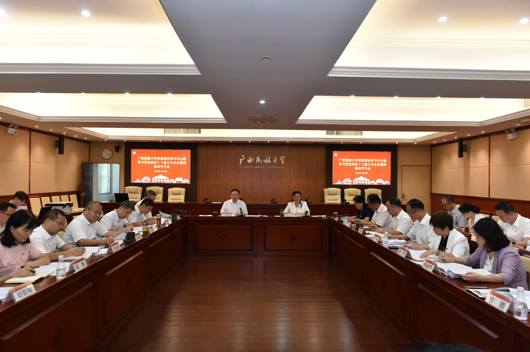 会议强调,认真学习贯彻党的二十届三中全会精神,是当前和今后一个时期的首要政治任务,也是推进特色鲜明的高水平现代化综合大学建设的重要政治责任。一要扎实学习,迅速掀起学习全会精神热潮。全校上下要将学习贯彻党的二十届三中全会精神同学习贯彻习近平新时代中国特色社会主义思想结合起来,同学习贯彻习近平总书记关于广西工作论述的重要要求结合起来,同学习贯彻习近平总书记来我校考察时的重要讲话精神结合起来,学深悟透、融会贯通。二要坚持问题导向,锐意进取推进学校全面深化改革。锚定国家全面深化改革的方向,锚定教育在国家战略中的地位和发展方向,锚定学校在服务党和国家重大战略决策与地方经济社会发展中的方向,锚定学校实际情况和已有的特色优势,凝聚起改革的高度共识,形成改革的强大合力。三要坚持和加强党的全面领导,打造落实立德树人根本任务、培养堪当民族复兴重任的时代新人的坚强阵地。牢记“国之大者”,深刻领悟“两个确立”的决定性意义,增强“四个意识”、坚定“四个自信”、做到“两个维护”,把坚持党的领导落实到办学治校的各个环节。