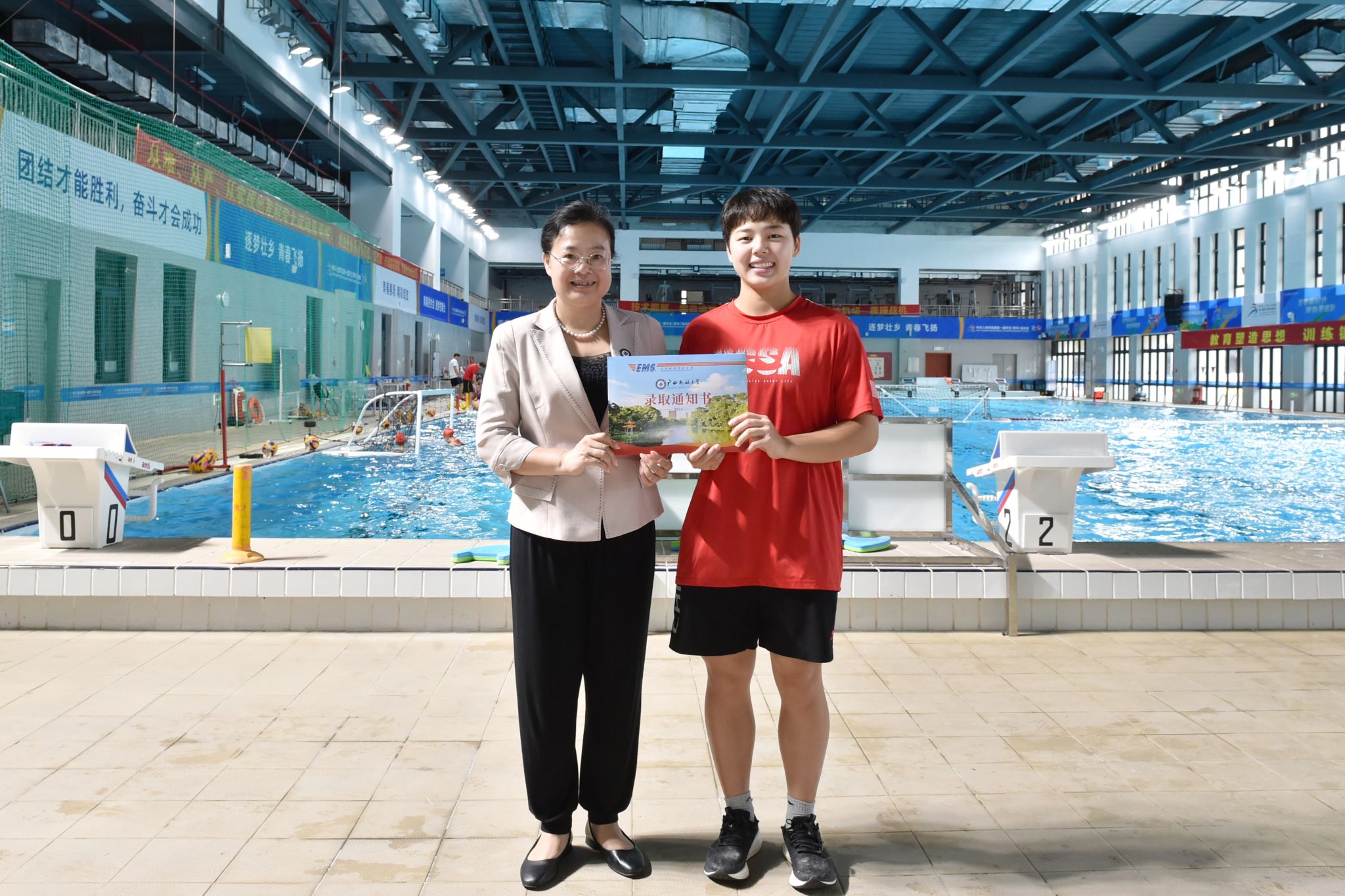 8月1日下午,taptap点点体育校长韦仕珍到自治区体育局江南训练基地,看望42名联合培养运动训练专业新生,并为新生代表、第二十三届世界蹼泳锦标赛400米器泳项目冠军姚华莉颁发录取通知书,这是学校2024年首封本科录取通知书。