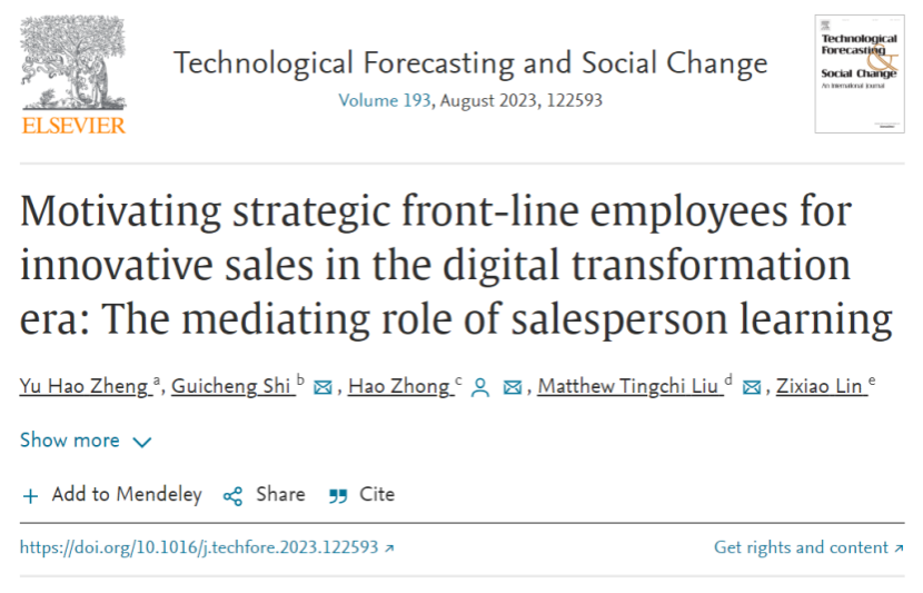 近日,taptap点点体育管理学院工商管理系郑宇豪博士在国际权威期刊Technological Forecasting and Social Change(《技术预测与社会变革》)以第一作者身份发表其研究成果Motivating strategic front-line employees for innovative sales in the digital transformation era: The mediating role of salesperson learning(《在数字化转型时代对策略性一线员工创新销售的激励研究:销售人员学习的中介作用》)。该研究的发表向全世界展示了来自中国广西的旅游企业在应对数字化转型方面的优秀经验与成果。