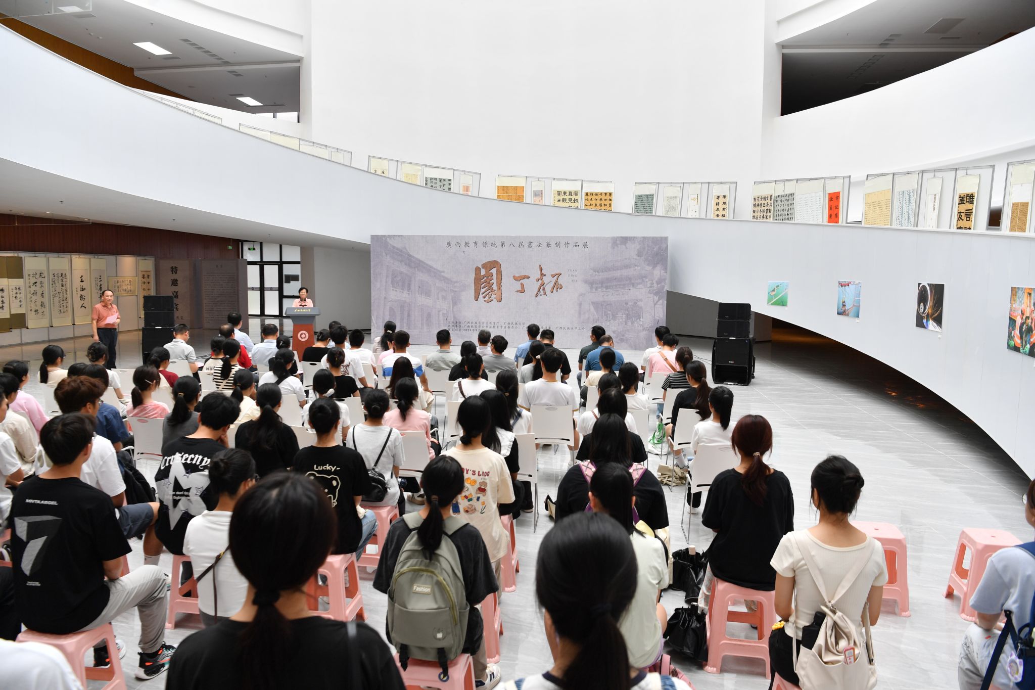 秦敬德宣布作品展开幕。她指出学习书法的重要性,建议广大师生溯源中华书法文化,坚持写好字、练好字,促进广西书法艺术蓬勃发展。