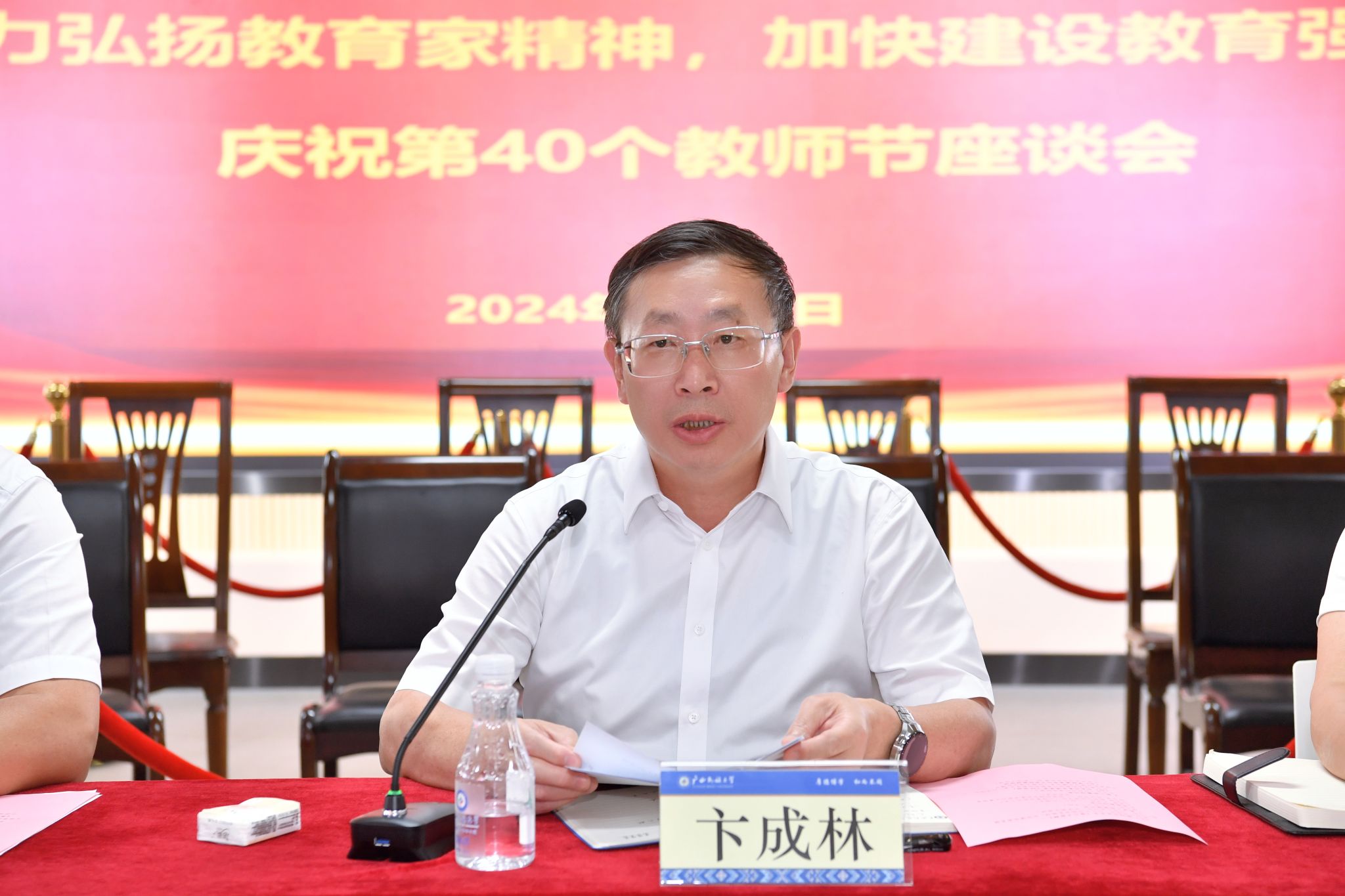 卞成林结合今年教师节“大力弘扬教育家精神,加快建设教育强国”主题提出三点意见。一是以教育家精神铸魂育人,坚定理想信念,涵养高尚师德;二是以教育家精神锤炼自我,增强育人本领,提升专业素养;三是以教育家精神引领发展,深化体制机制改革,营造良好环境。卞成林强调,全校教师要深刻领会教育家精神的科学内涵、时代价值和实践要求,为全面建设特色鲜明的高水平现代化综合大学而团结奋斗,为强国建设、民族复兴伟业培育新人,输送力量。