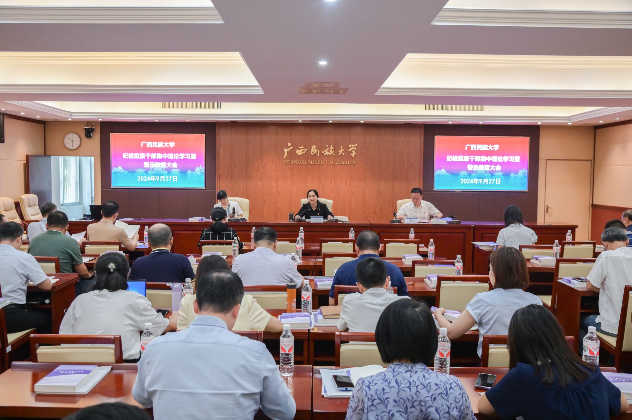9月27日,自治区纪委监委驻校纪检监察组组长,学校党委副书记、纪委书记韦雪芳主持召开纪检监察干部集中理论学习暨警示教育大会,强调把学习贯彻党的二十届三中全会精神作为当前重大政治任务,聚焦主责主业,发挥监督保障执行、促进完善发展作用,积极协助学校党委推进党风廉政建设,深化全面从严治党,推动学校高质量发展。(初审:吴易安 复审:潘之铭 终审:王文娟)