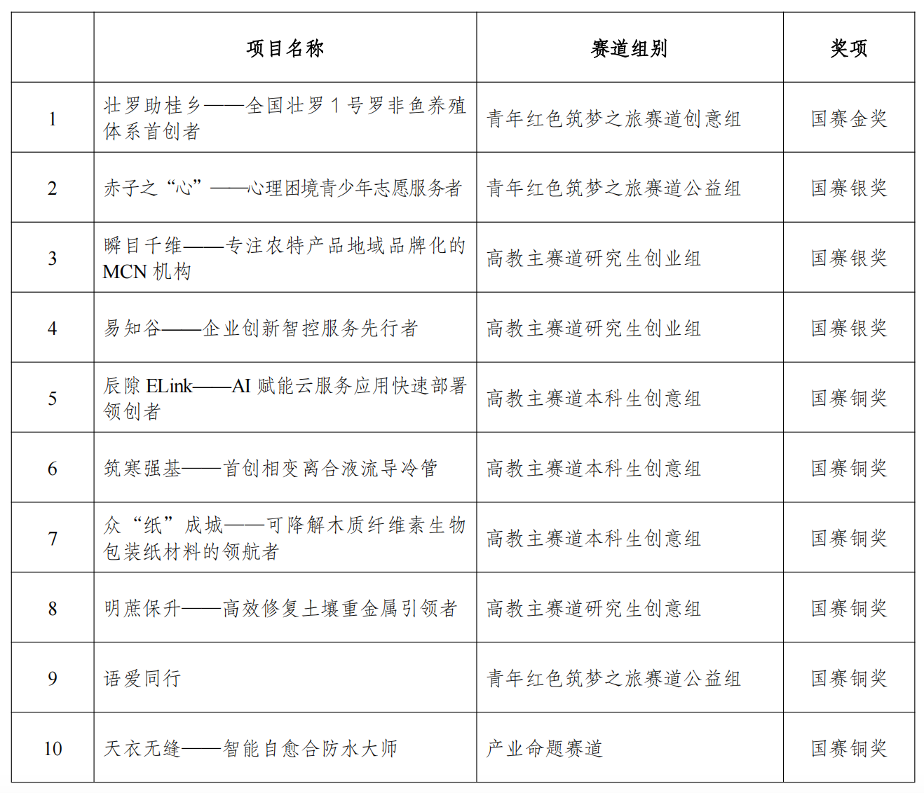 国赛项目获奖名单