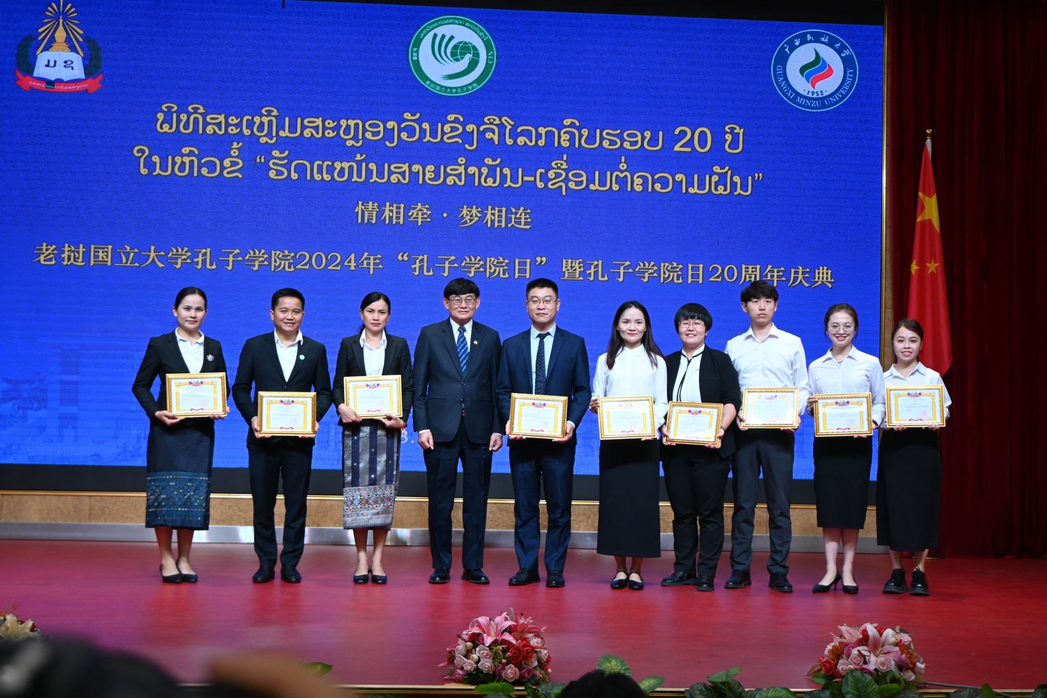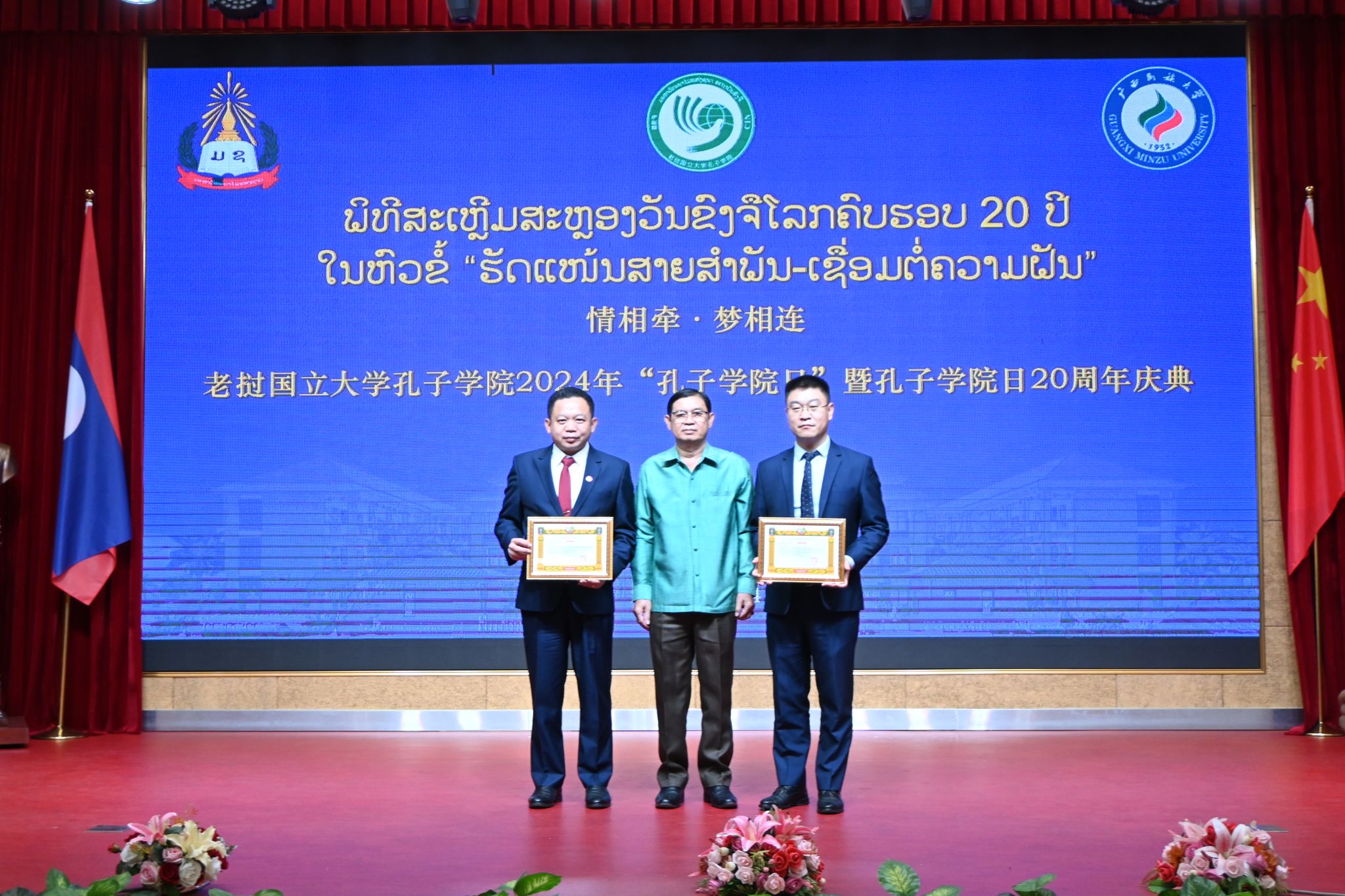 11月23日,老挝政府授予老挝国立大学孔子学院中方院长罗明“友谊勋章”仪式在老挝国立大学孔子学院举行。中国驻老挝大使方虹,老挝教育体育部部长普·希玛拉翁,老挝党中央组织部副部长维素·朋佩塔,老挝公安部安全总局办公厅司长占塔翁,老挝国防部办公厅司长沃拉高,老挝国立大学校长德萨努拉·森德登,孔子学院中方卸任院长罗明、新任院长冯光火,老方院长李建民出席仪式。