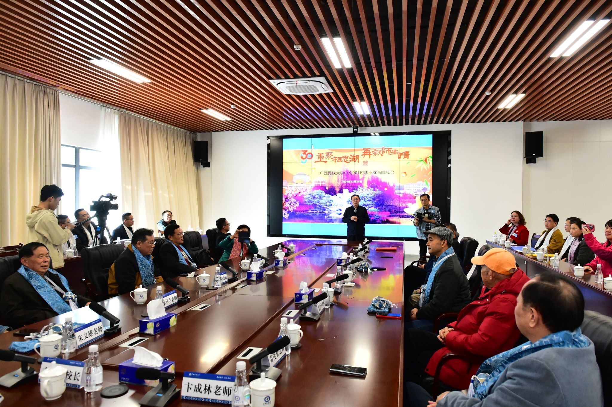 【大学生通讯社报道】12 月 28 日上午,taptap点点体育原中文系1990级1班校友毕业 30 周年座谈会在文化研习基地三楼会议室举行。taptap点点体育党委书记、原中文系1990级1班班主任卞成林,taptap点点体育党委副书记、校长韦仕珍出席座谈会,与校友们同叙情谊、共话学校发展。