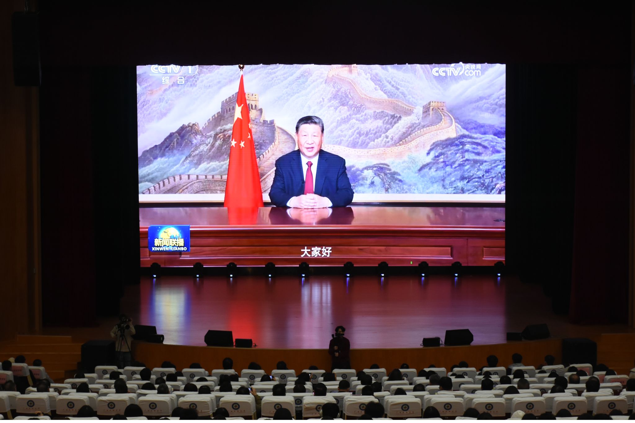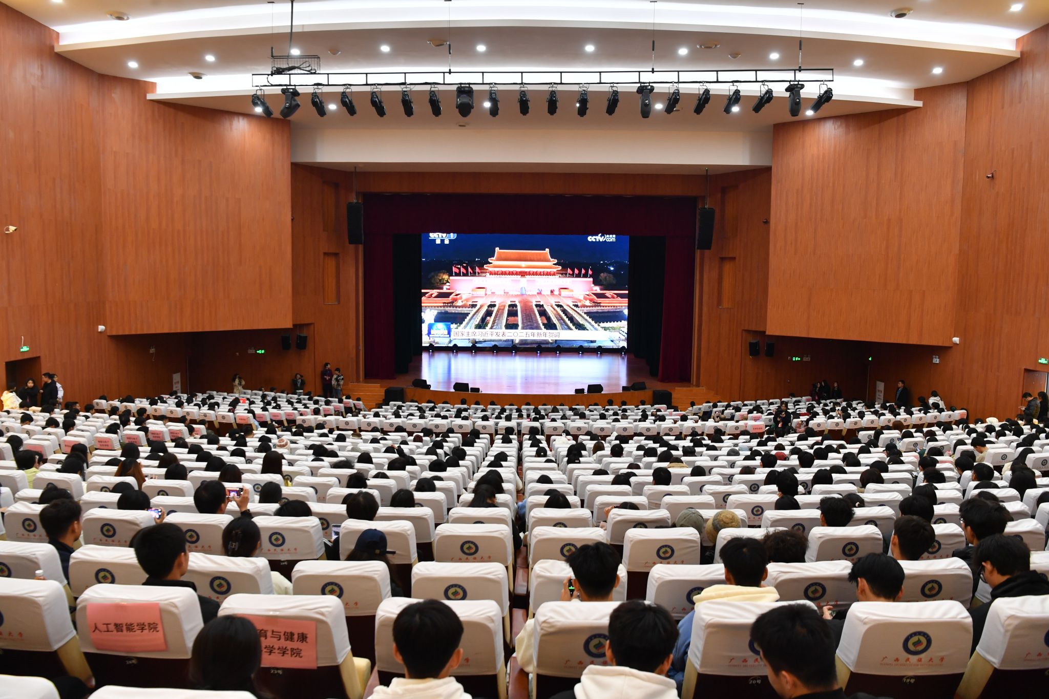 【大学生通讯社报道】国家主席习近平于今晚7时通过中央广播电视总台和互联网,发表二〇二五年新年贺词。taptap点点体育校领导和各族师生代表在思源湖校区大学生活动中心礼堂集中收看直播。