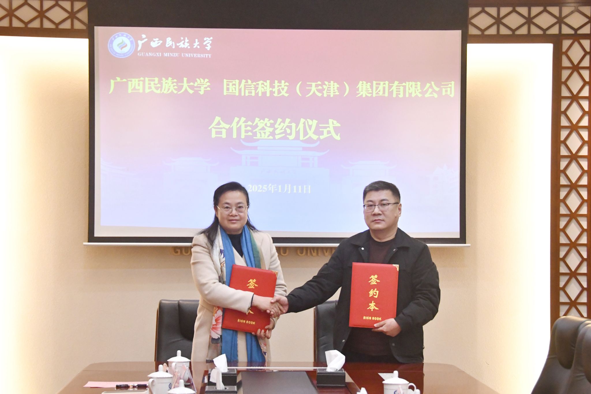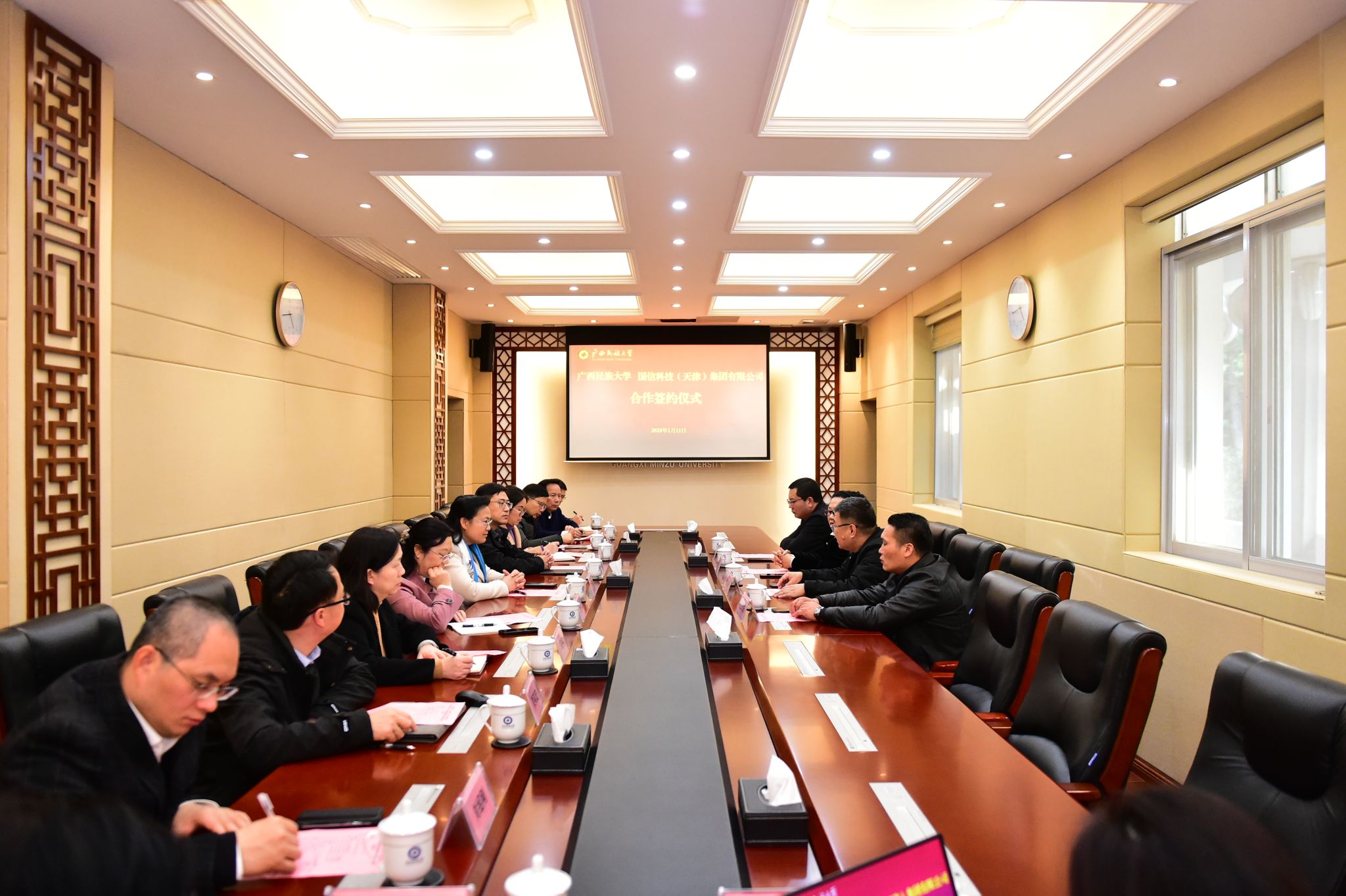 韦仕珍代表学校对唐晓春一行的到来表示热烈欢迎,分析了双方合作所面临的机遇和挑战。韦仕珍表示,希望国信科技(天津)集团有限公司紧密结合广西发展实际,明确公司在广西发展的方向和定位。学校将充分发挥人才资源与科研优势,为双方合作提供坚实的智力支持,共同努力打造出具有广泛影响力的合作示范项目。