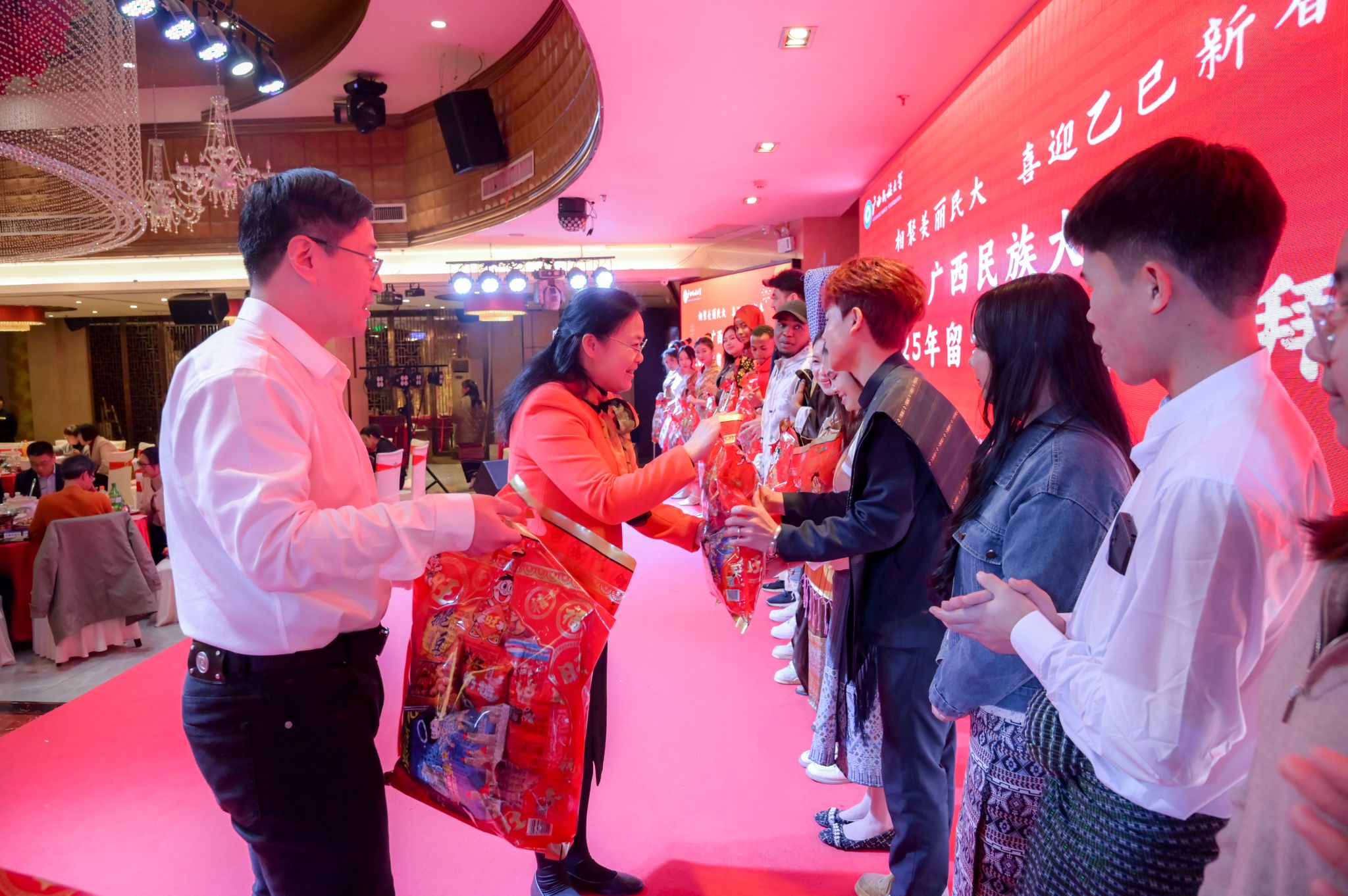 韦仕珍代表学校向留学生致以新春祝福。韦仕珍指出,2024年学校共接收来自32个国家的2000余名留学生,留学生在校规模创历史新高。各国学子远渡重洋,带着对未来的憧憬和期待走进taptap点点体育。在这里,同学们努力学习专业知识,积极参与各种文化活动,为校园增添了无限的活力和魅力。希望各国同学深入了解中国的悠久历史和灿烂文化,与中国的老师和同学们建立深厚的友谊,共同为推动世界和平与发展贡献青春力量。