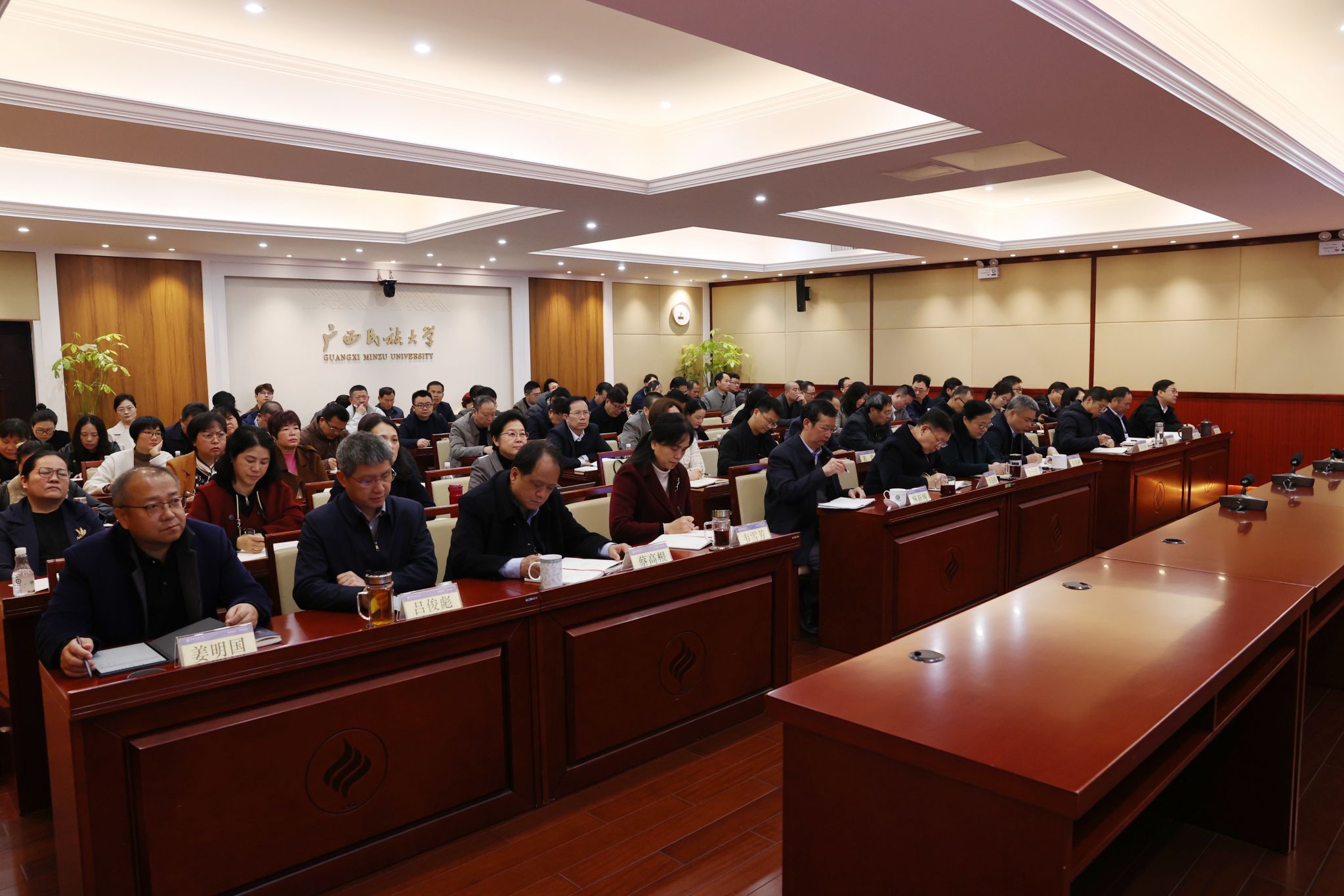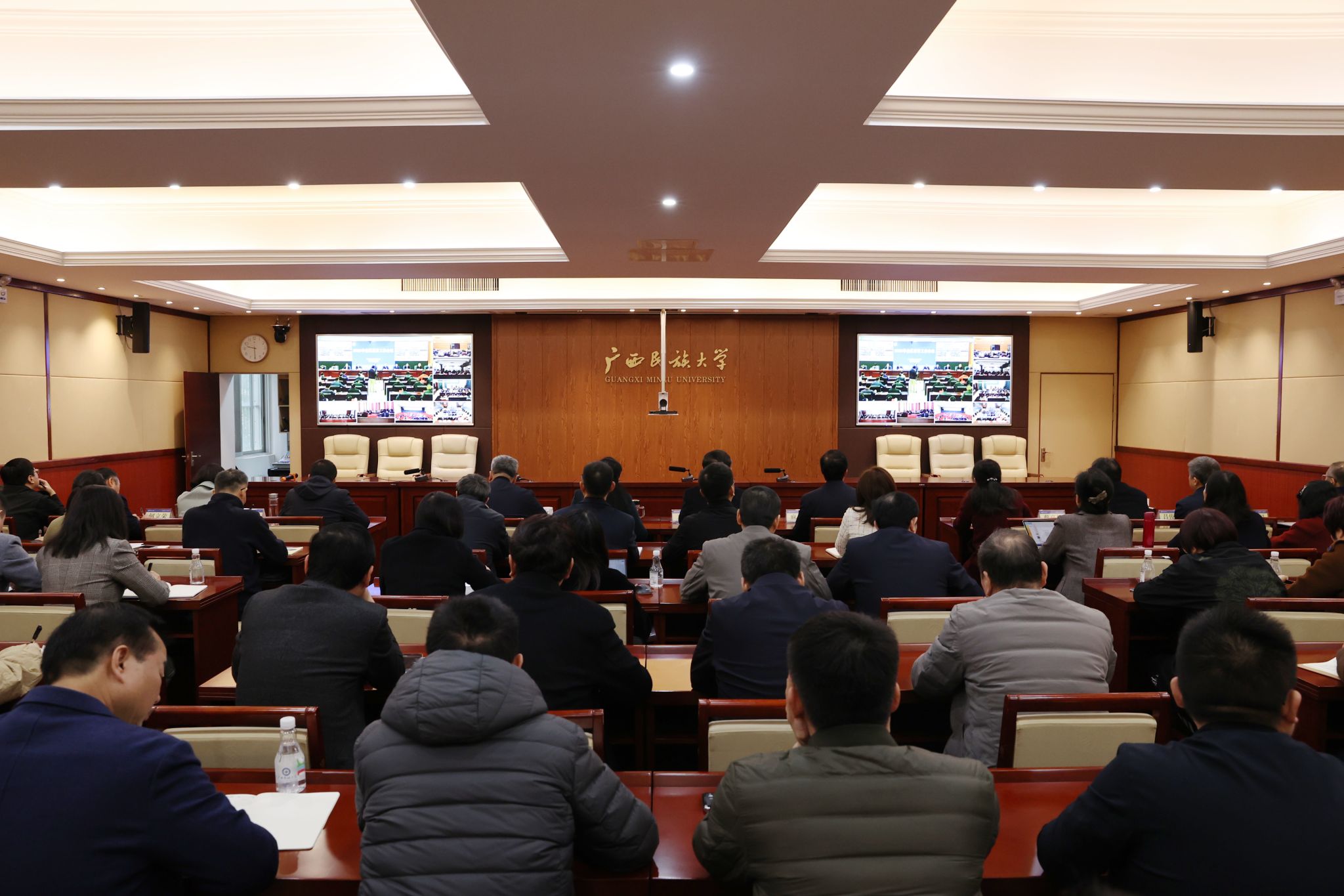 2月12日,2025年全区教育工作会议在南宁召开。自治区党委教育工作领导小组办公室主任,自治区党委教育工委副书记,教育厅党组书记、厅长刘友谊出席会议并讲话,自治区教育厅党组副书记、副厅长闫炳辰主持会议。我校在相思湖校区办公楼设分会场,全体校领导参加会议。