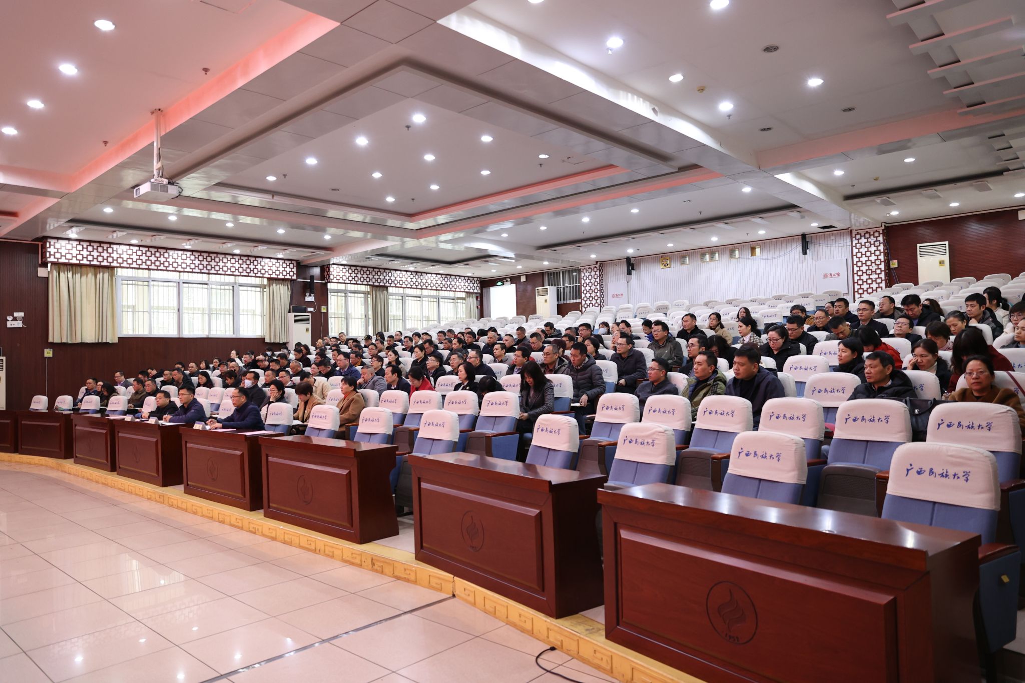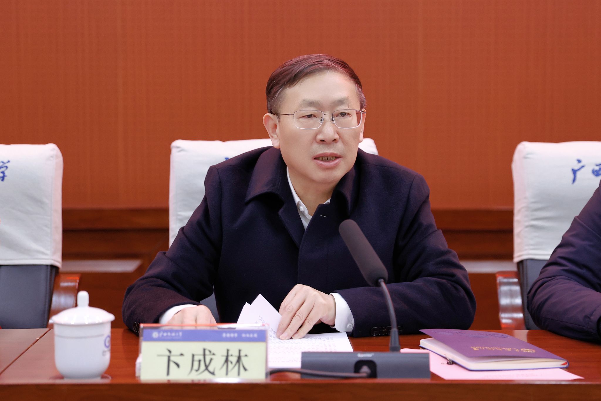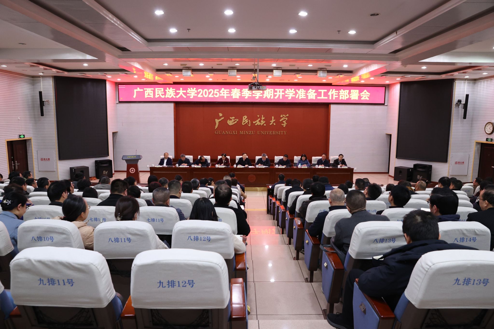 卞成林传达了广西“新春第一会”坚持“解放思想、创新求变,向海图强、开放发展”推动经济高质量发展大会,2025年全区组织部长会议,2025年全区教育工作会议,2025年全区高校党的建设工作会议等会议精神,强调要认真贯彻落实会议精神,坚持实干为要、创新为魂,用业绩说话、让人民评价,把精力集中到干事创业上来,谋划全年重点工作,主动用人工智能赋能每个单位、各项工作改革发展,推动党的建设、教学科研、安全保障等各项工作高起点布局、高质量发展,加快实现学校治理体系和治理能力现代化,共同唱响加快高质量发展主旋律。