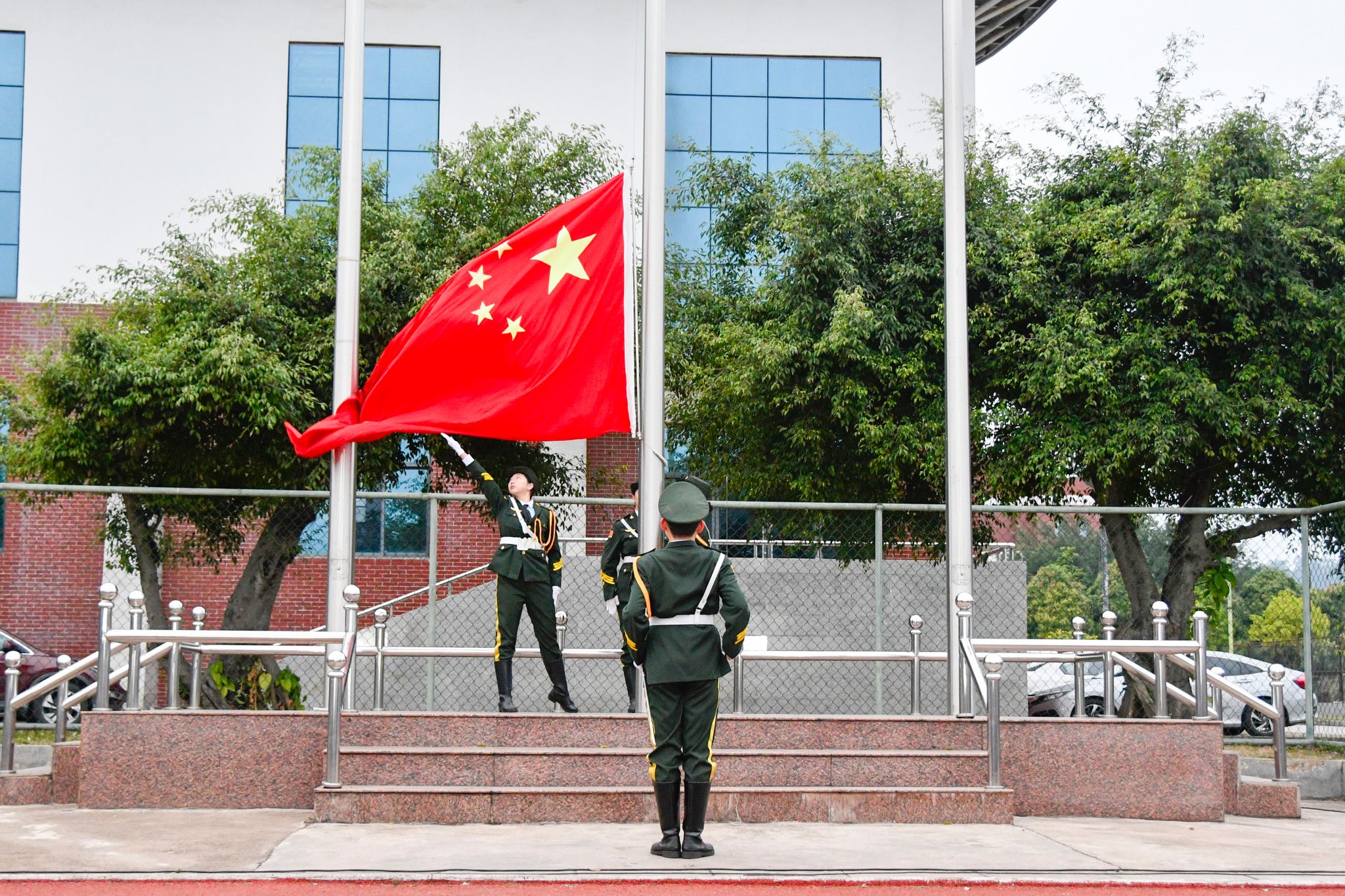 7时20分,升旗仪式正式开始,国旗护卫队雄姿英发,踏着有力的步伐护送国旗入场,伴着慷慨激昂的《义勇军进行曲》,五星红旗冉冉升起。师生们庄严肃立,列队整齐,向国旗行注目礼。