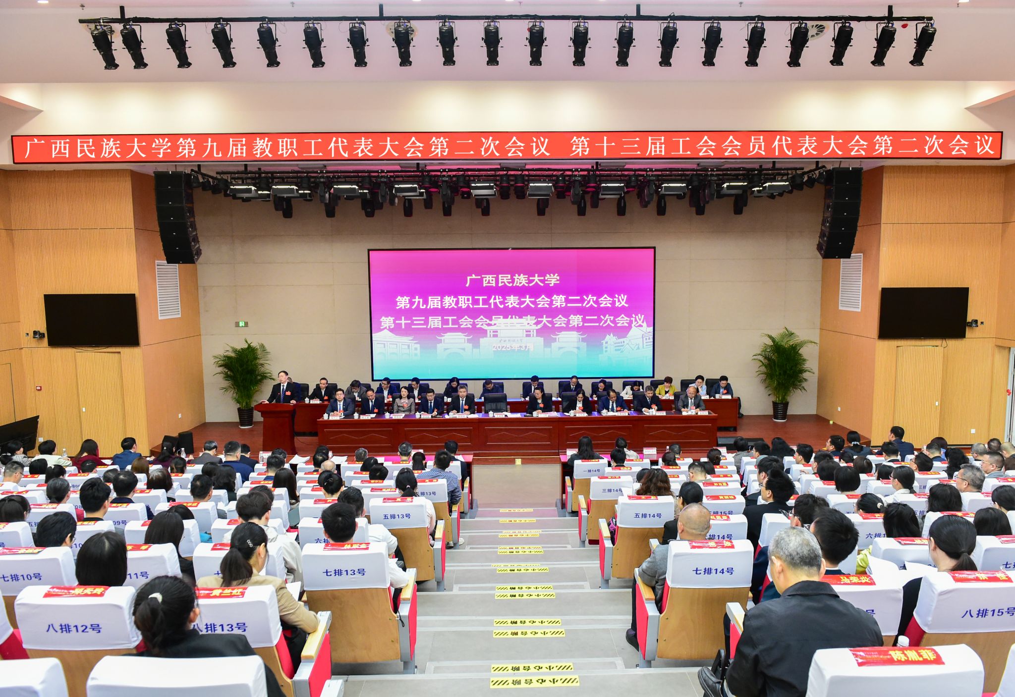 韦仕珍以“实干为要、创新为魂,奋力谱写特色鲜明的高水平现代化综合大学新篇章”为题作学校工作报告。报告指出,上一年度,学校落实立德树人根本任务,扎实开展党纪学习教育,全面深化综合改革,持续加强内涵建设,学校各项工作有序开展,事业发展稳步推进。韦仕珍对2025年学校重点工作进行部署。韦仕珍强调,要全面贯彻落实党的二十大和二十届二中、三中全会精神,深入学习贯彻习近平总书记关于教育的重要论述和全国、全区教育大会精神,以铸牢中华民族共同体意识为主线,坚持和加强党对学校工作的全面领导,深化教育综合改革,扎实推动高质量发展。一是全面加强党的领导,实现管党治校水平新提升;二是全面落实立德树人根本任务,持续提升人才培养质量;三是对标一流建设目标,推进学科整体水平提升;四是聚焦国家战略需求,强化有组织科研;五是加强人才人事工作,打造人才队伍新高地;六是精准对接发展所向,构建服务社会新体系;七是探索交流合作新范式,推进全方位高水平对外开放;八是践行师生至上理念,持续增进师生福祉。