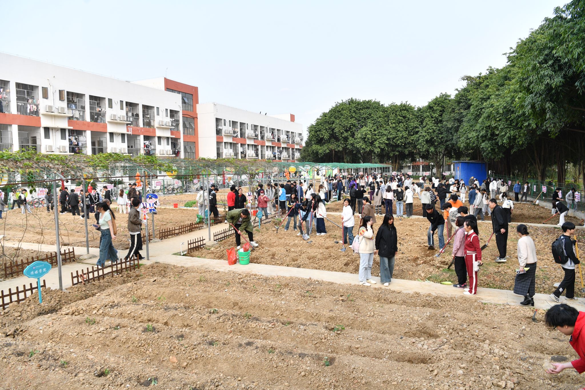 校领导与同学们一同放飞象征丰收与希望的五彩气球,手持农具走进“那园”,进行农耕实践。