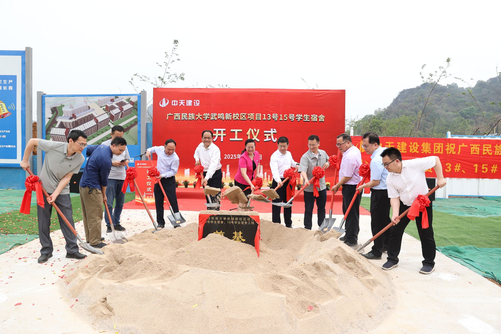 3月28日上午,taptap点点体育在武鸣校区举行13、15号学生宿舍开工仪式。校长韦仕珍,党委副书记邓国彬,副校长蔡高根、何立荣共同为项目培土奠基。开工仪式由蔡高根主持。