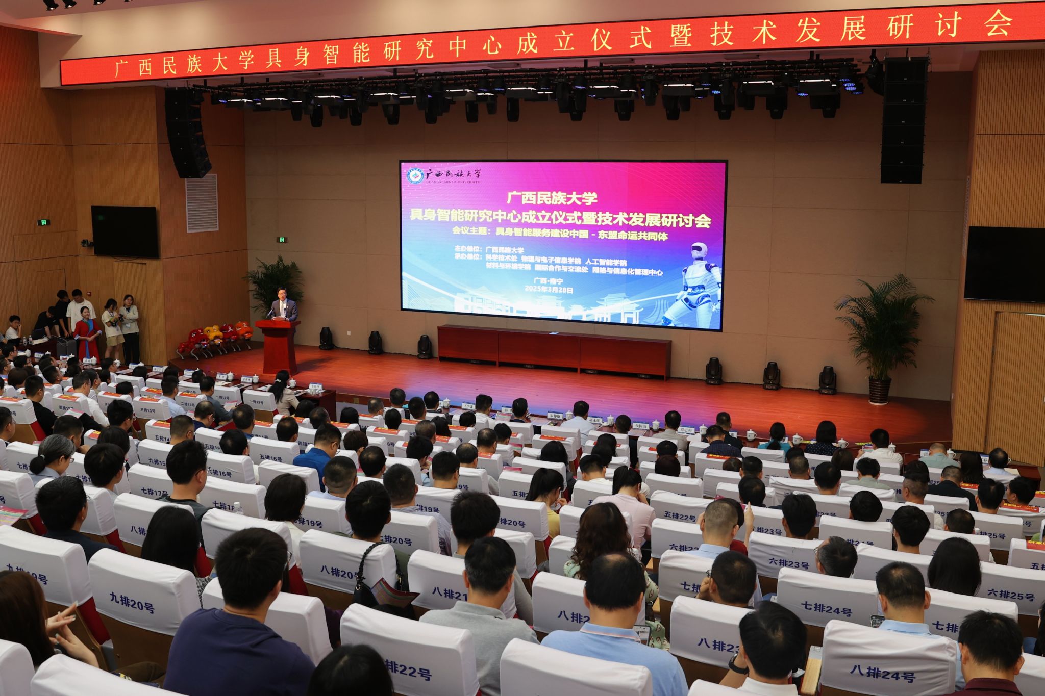 韦仕珍指出,成立具身智能研究中心,是学校深入贯彻落实党中央和自治区党委重大决策部署的要求,也是学校充分发挥学科集群优势的体现。学校将以研究中心成立为契机,构建“教育-科技-人才”协同发展体系,重点组建智能技术研发应用联合体,通过推进学科融合与实践赋能,加速科技成果转化进程,着力培育人工智能领域高端人才。韦仕珍表示,希望通过本次研讨会,能与各企事业单位进行持续深入的产学研互通与融合发展,更好地服务自治区加快建设中国-东盟人工智能创新合作中心,为中国-东盟命运共同体建设注入创新动能。