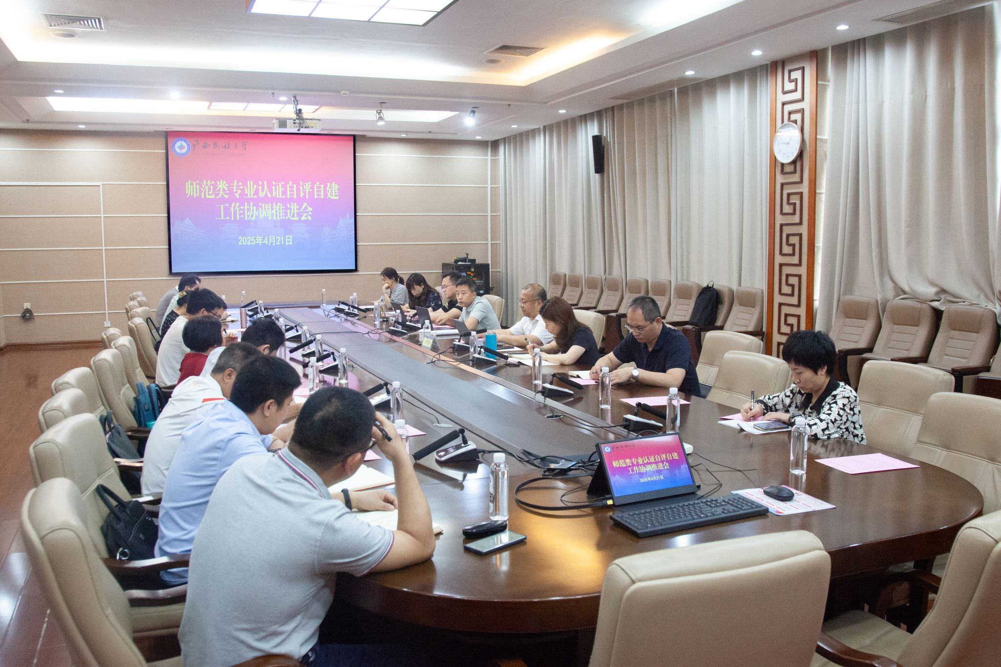 4月21日,副校长姜明国主持师范类专业认证自评自建工作协调推进会时强调,加强师范生培养成果文化建设展示和师范生技能展示,积极对接校外资源推进深入合作,科学、全面、准确展示学校在师范生培养中的水平、质量与特色。(初审/严军 复审/荣子卿 终审/孙寿媚)