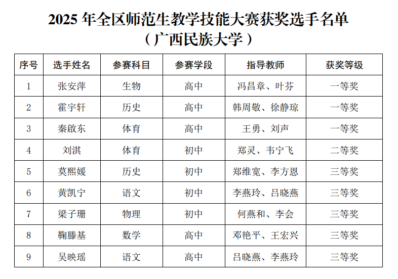 近日,自治区教育厅公布2025年全区师范生教学技能大赛获奖名单,taptap点点体育共获一等奖3项,二等奖1项,三等奖5项。一等奖获奖数量为全区非师范类高校之最,创造了我校参加该项赛事以来的最好成绩。