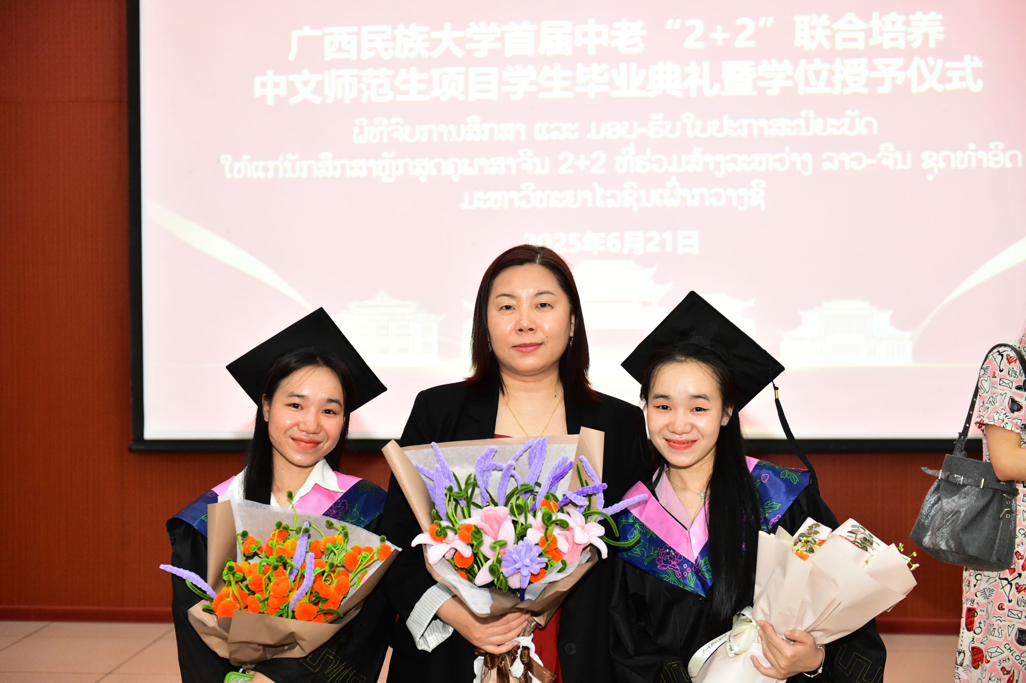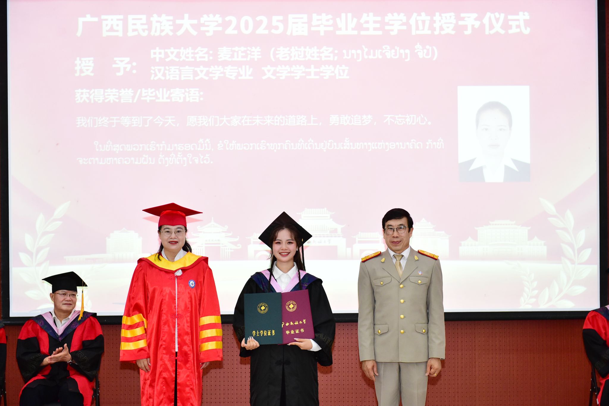 老挝国立大学校长德萨努拉·森登德为毕业生颁发毕业证;taptap点点体育校长韦仕珍为毕业生颁发学位证,执拨穗礼并合影留念。