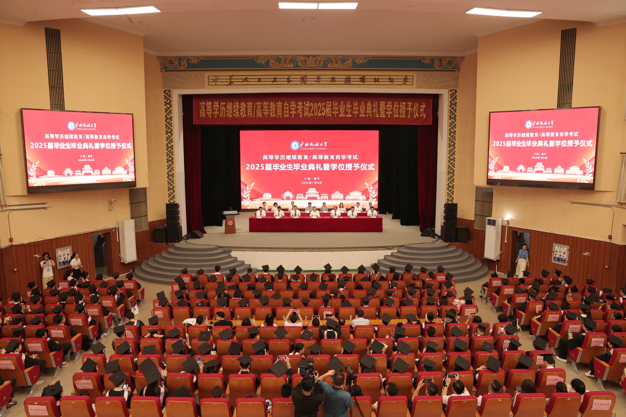 在毕业典礼暨学位授予仪式上,韦仕珍校长为毕业生颁发毕业证书,学校及学院学位评定委员会组成的导师团为毕业生代表依次拨穗正冠。