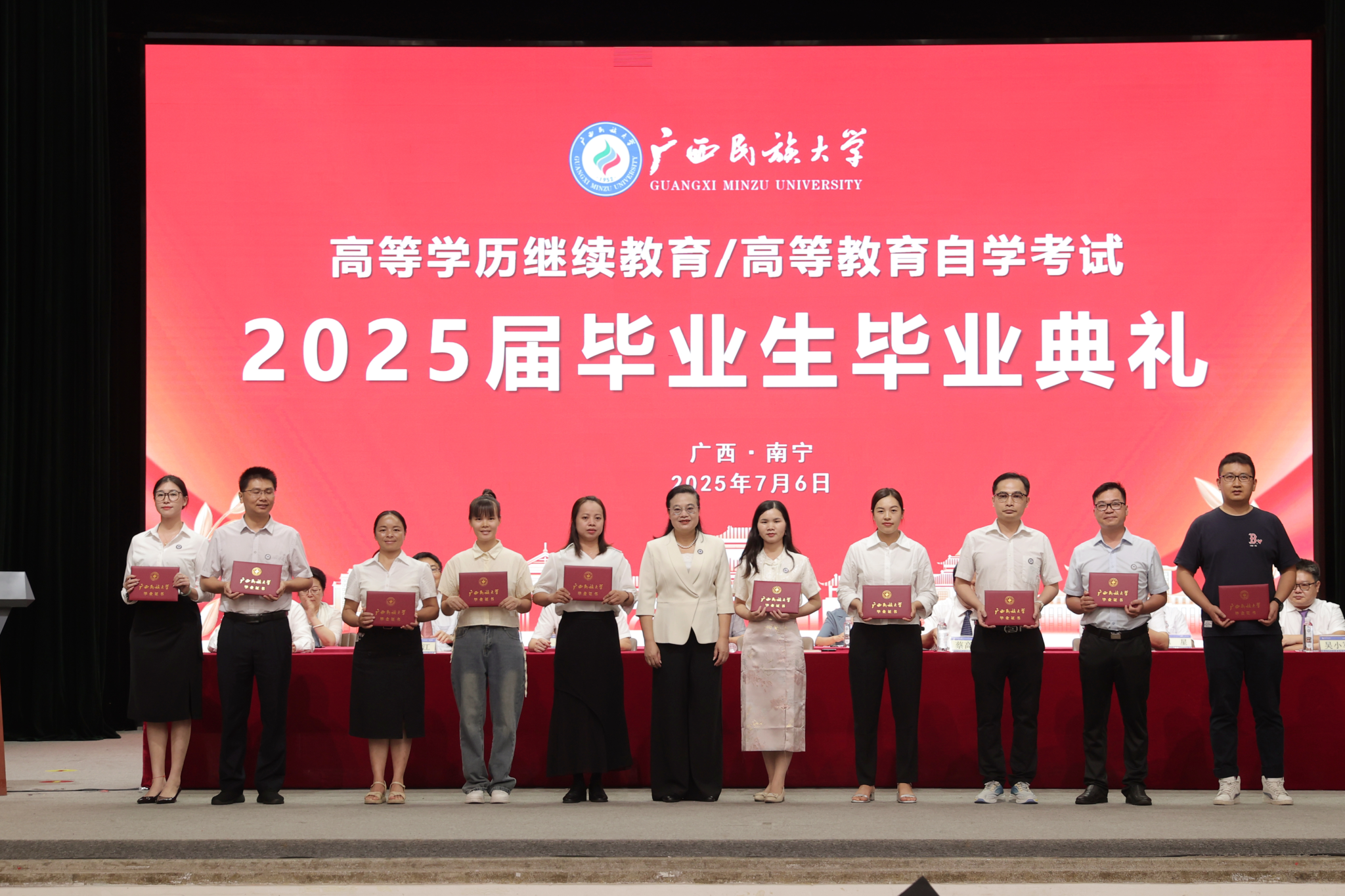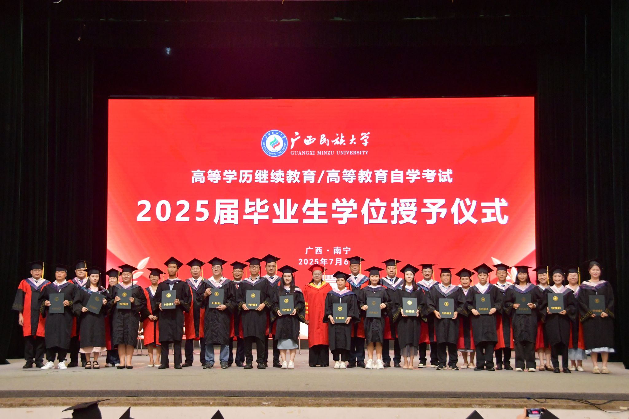 韦仕珍表示,高等学历继续教育和高等教育自学考试是学校教育事业的重要组成部分,学校深入学习贯彻党的二十大精神,推进数字化教学与管理转型,通过“线上教学+线下面授”“自主学习+协作学习”的混合式教学以及全流程管理服务平台,助力学子完成学业。韦仕珍勉励全体毕业生,一是做“终身学习”的践行者,毕业是终身学习征途的新启航,要始终保持“空杯心态”,以“持续充电”的行动自觉突破职业天花板,让终身学习成为破解时代挑战的“金钥匙”;二是做“超越自我”的奋斗者,毕业是人生新篇的序章,毕业生们要勇敢追求梦想,接续奋斗,用实际行动不断诠释“天道酬勤”的真谛;三是做“脚踏实地”的实干者,人生没有捷径,要一步一个脚印地把本职工作做深做实,在摸爬滚打中增长才干,在层层历练中积累经验,在攻坚克难中提升本领,让自己在实干中绽放绚丽光彩。