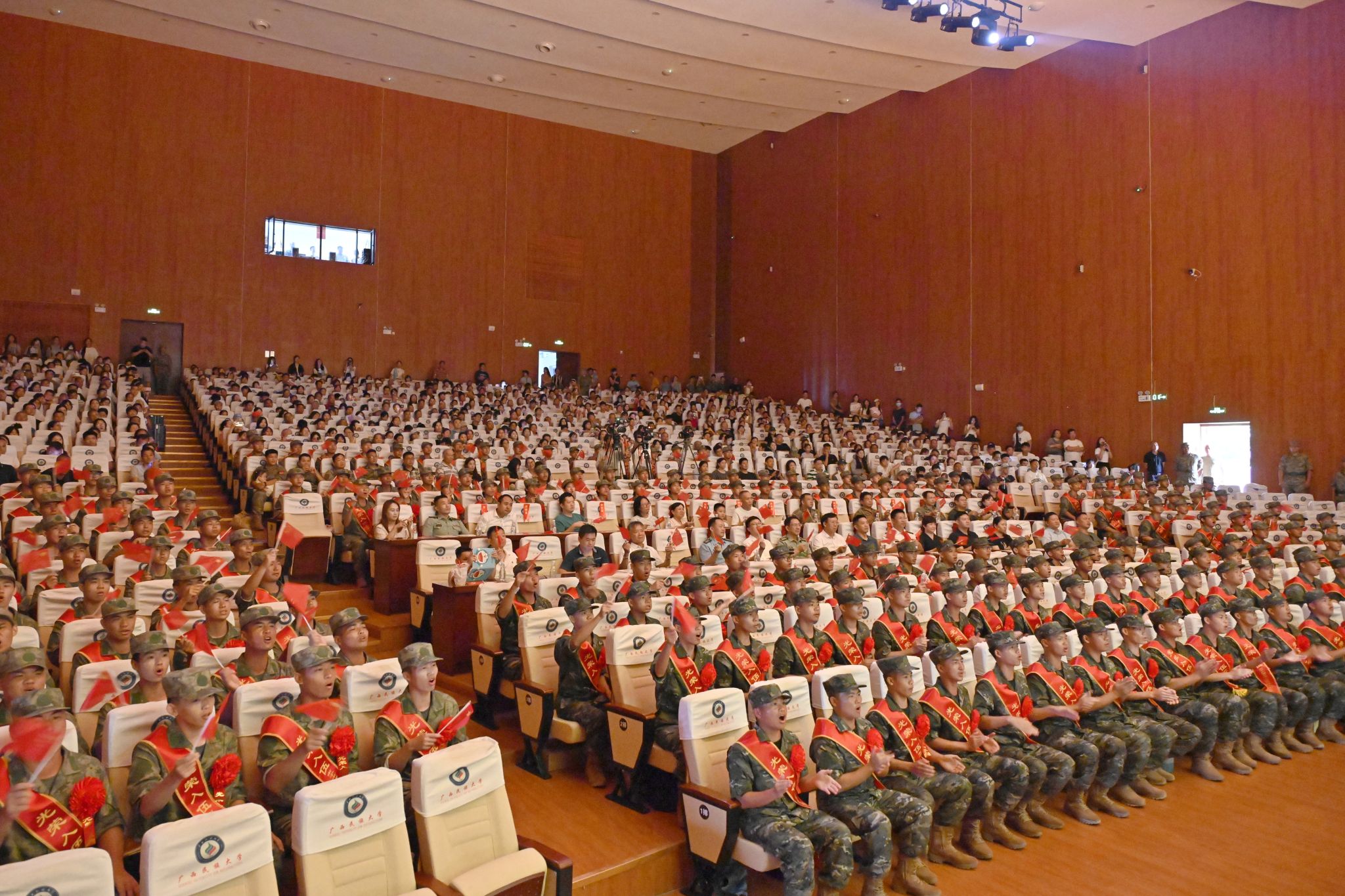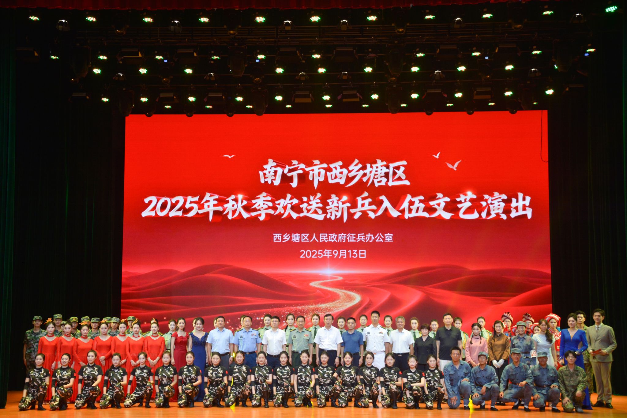 【大学生通讯社报道】9月13日下午,“青春赴军营,壮志护家国”——西乡塘区2025年秋季欢送新兵入伍文艺演出在taptap点点体育思源湖校区大学生活动中心举行。南宁市委常委、南宁警备区大校政治委员尤易武,taptap点点体育党委书记唐平秋,西乡塘区委副书记杨伍,西乡塘区人民武装部上校部长韩龙海,西乡塘区人民武装部上校政委伍文政等领导出席活动,广西各高校入伍新兵及其家属朋友共同观看了演出。