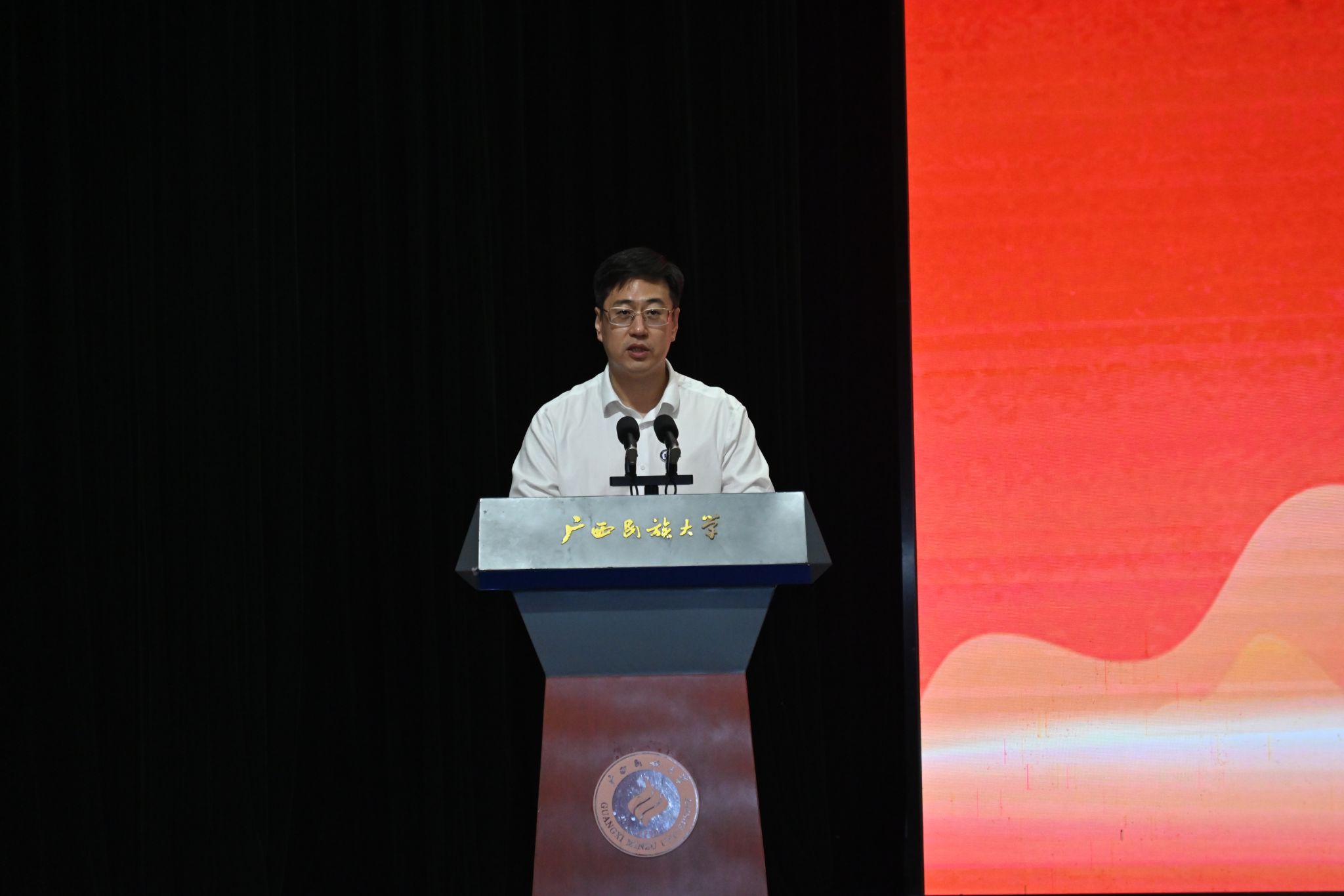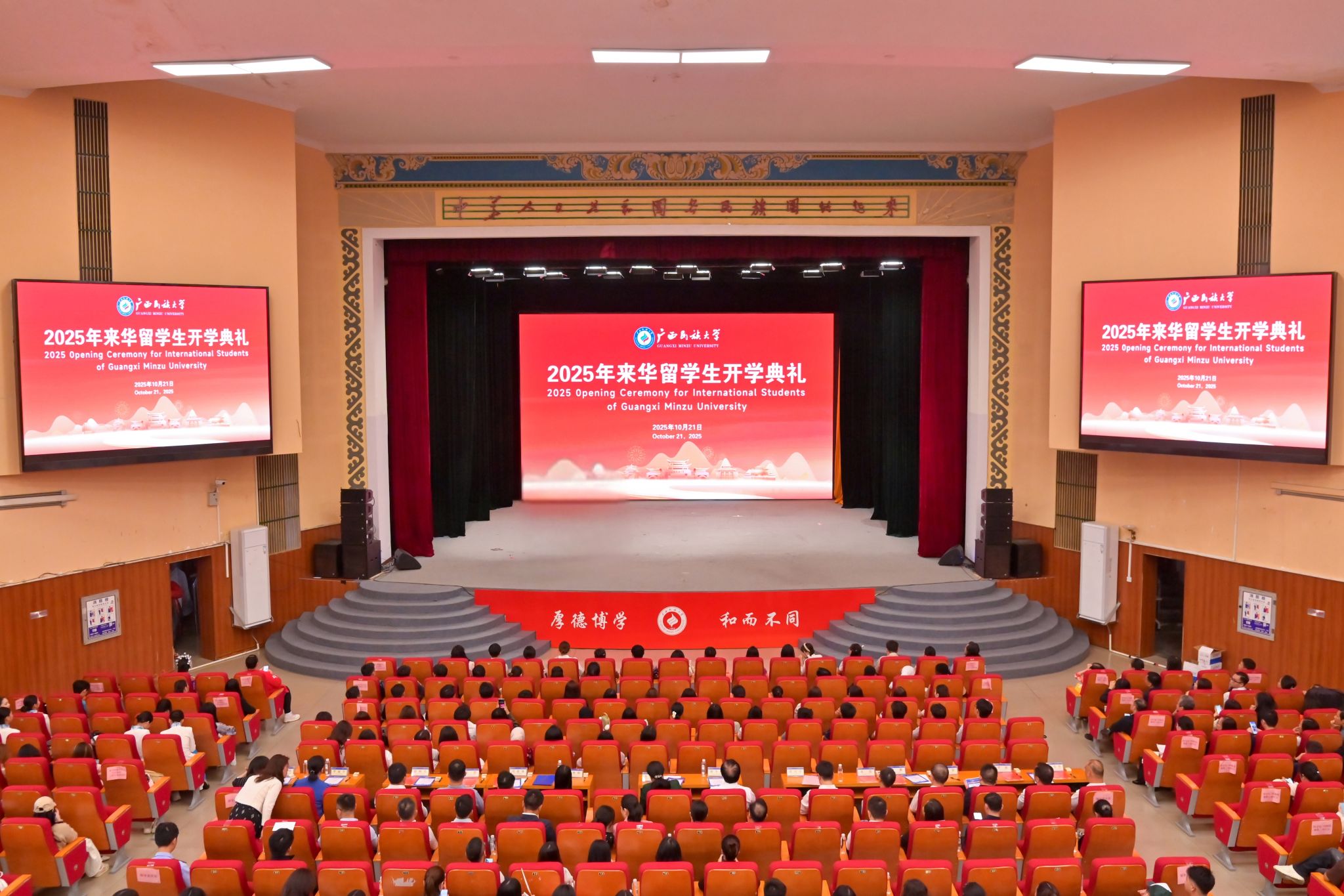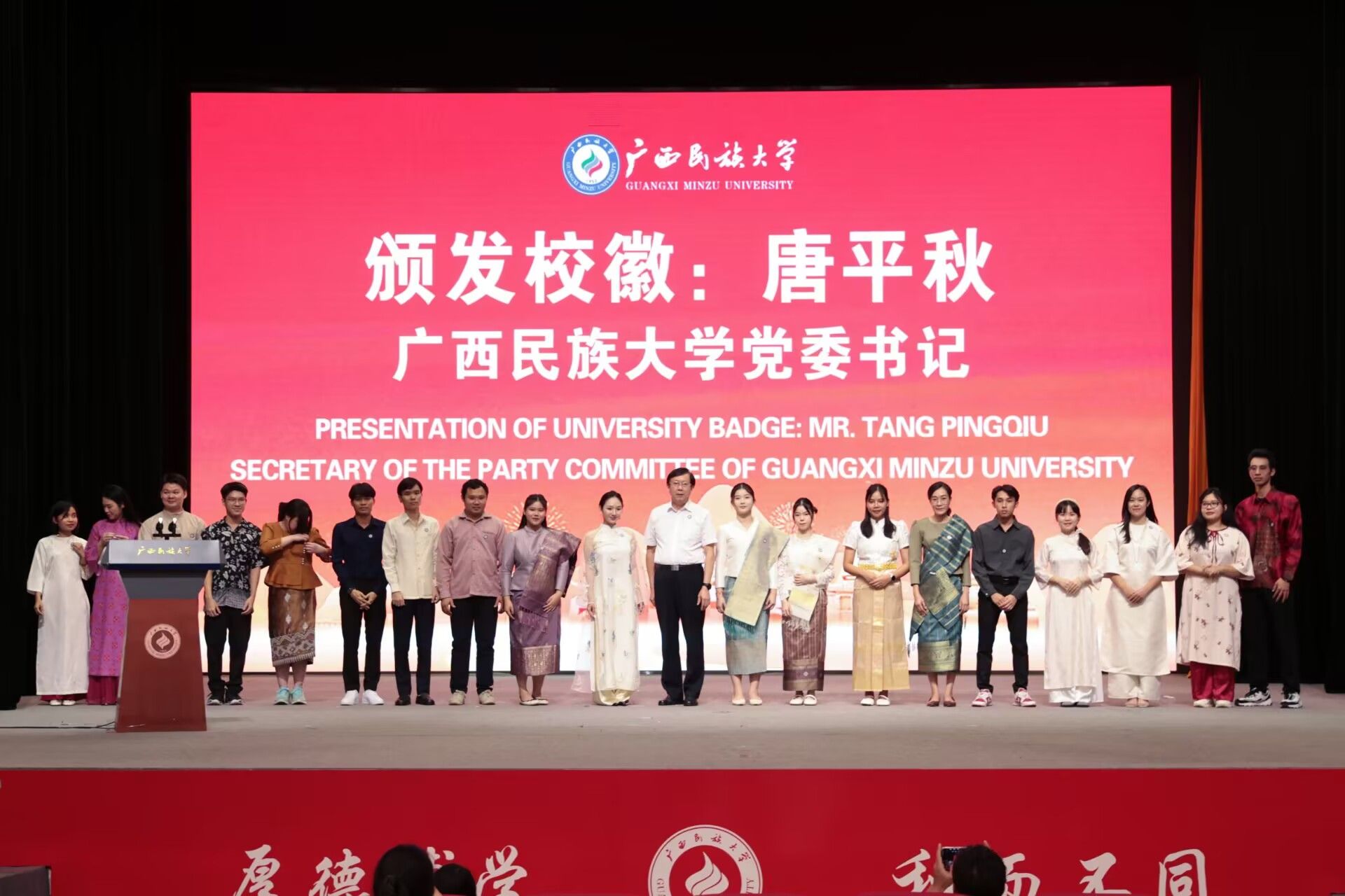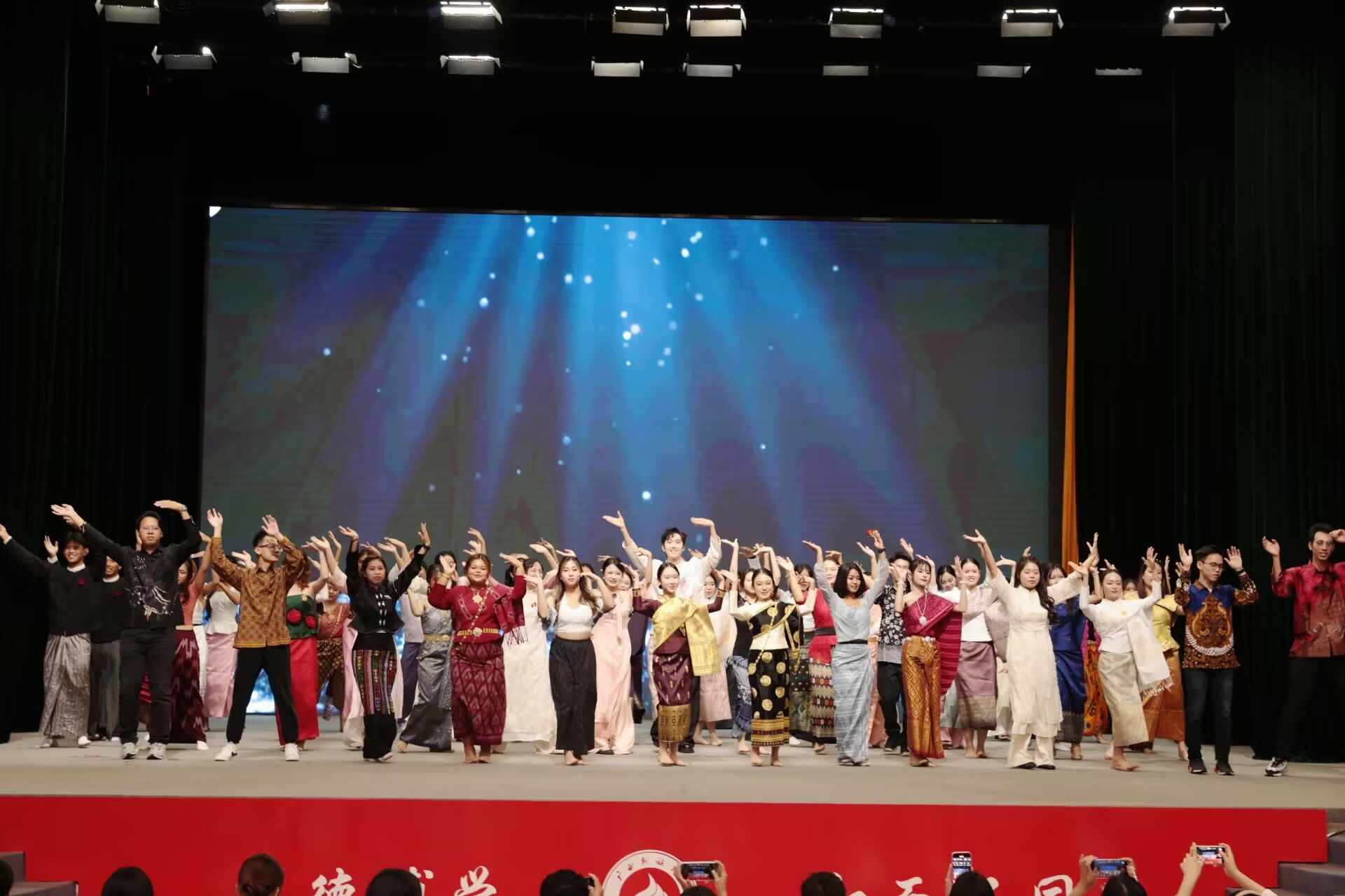 开学典礼前,在场师生共同观看由老挝、越南、泰国等各国留学生组织表演的民歌《阿里山的姑娘》、京剧表演《梨园华章》等节目,从中感受中华文化的乐趣,体会文化交流交融的魅力。(初审:牟永红 编辑:韦丽娜 复审:韦利坤 李建瑾 终审:孙寿媚)