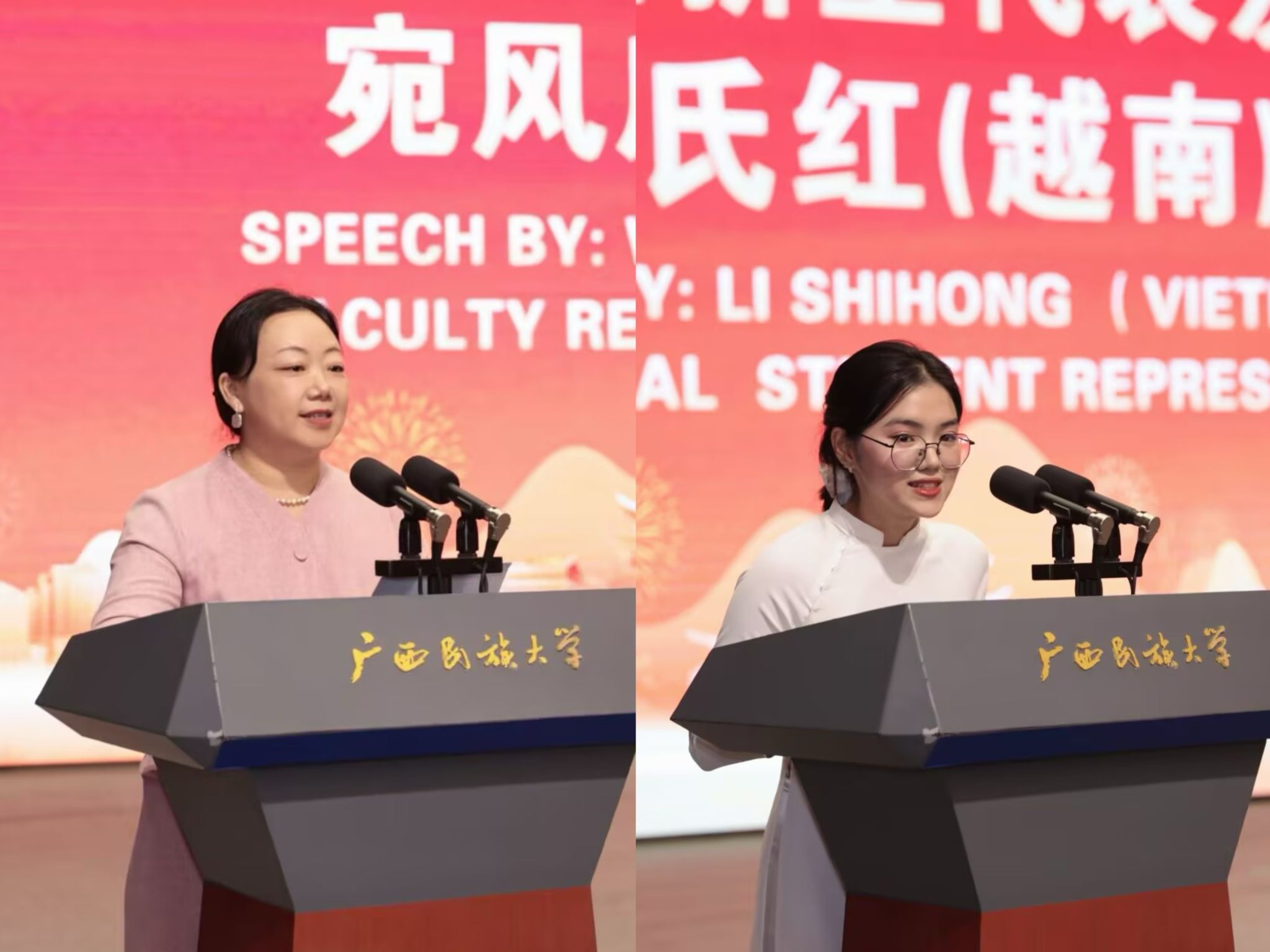 教师代表宛风庆,越南籍留学生新生代表黎氏红发言