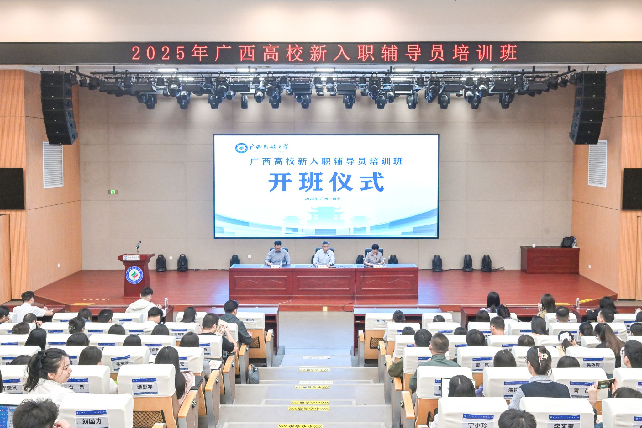 10月21日,校党委副书记陈铭彬在广西高校新入职辅导员培训班开班仪式上强调,各辅导员要提高政治站位,争做立场坚定的引领者;明确身份定位,争做管理服务的知心人;提升职业素养,争做协同育人的好老师。(初审/肖耀科 图/刘健鸿 文/莫欣姚 编/梁晶晶 复审/韦利坤 终审/孙寿媚)