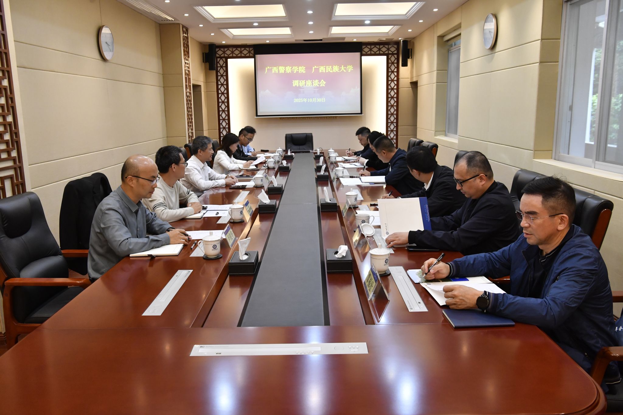10月30日,校党委常委、副校长吕俊彪会见广西警察学院副院长唐魁彪一行,双方就校园基建、学科建设、机构管理模式创新等议题展开交流,希望加强交流合作,深化资源共享,共促院校高质量发展。(初审/刘银妹 图文/罗洁妮 编/李杨洁 复审/韦利坤 终审/孙寿媚)