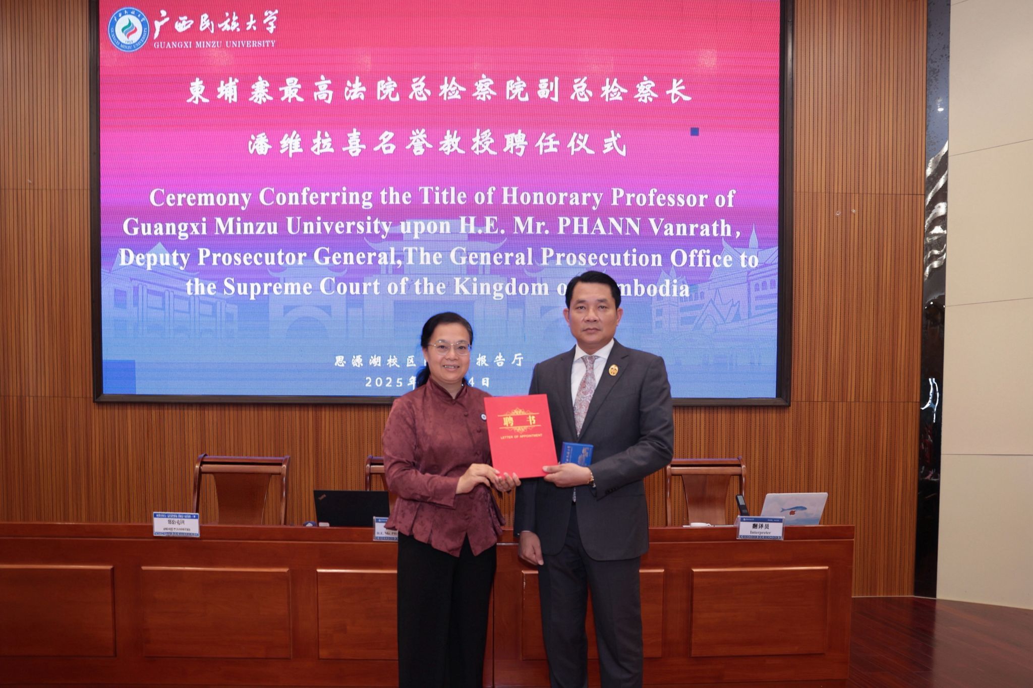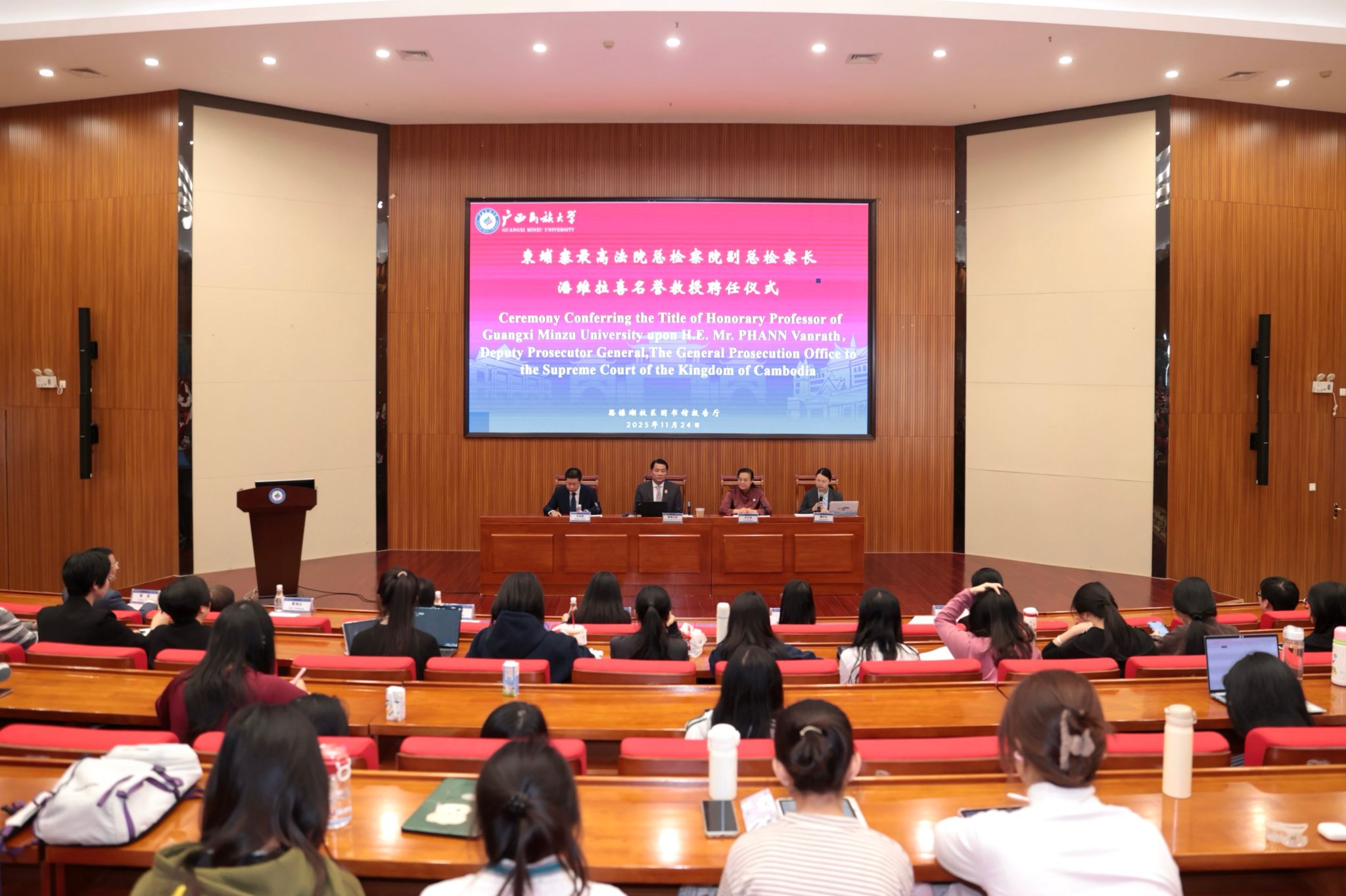 【大学生通讯社报道】11月24日下午,taptap点点体育在思源湖校区图书馆二楼报告厅举行名誉教授聘任仪式,聘任柬埔寨最高法院总检察院副总检察长潘维拉喜(H. E. PHANN VANRATH)为名誉教授,校长韦仕珍出席仪式并为潘维拉喜颁发聘书。校党委副书记、中国-东盟法学院院长邓国彬出席并主持仪式。