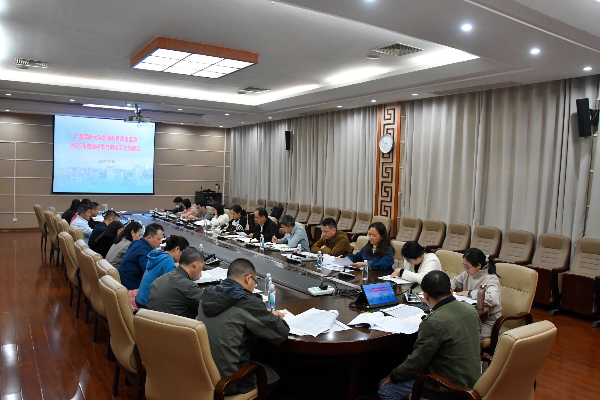 12月3日,校党委常委、副校长蔡高根在高等教育质量监测2025年数据采集与填报工作部署会上表示,各单位主要领导要提高政治站位,确保数据采集工作层层落实,严把质量关;坚持“业务内容归属单位填报审核”原则,确保数据之间形成逻辑闭环;研判数据价值,强化优势,靶向改进,为学校高质量发展及科学决策提供有效支撑。(初审/严军 图文/黄美丽 编/黎倩雅 实习编辑:樊甲利 复审/韦利坤 终审/孙寿媚)