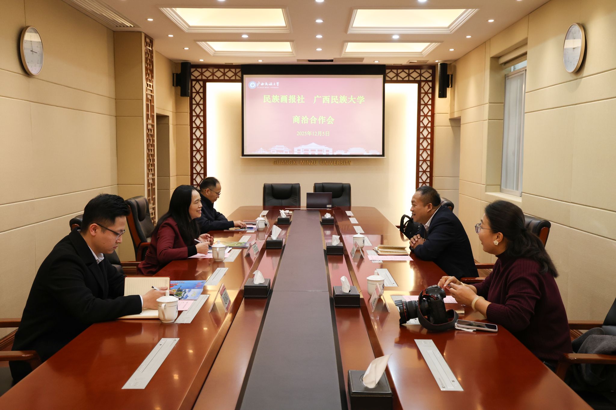 12月5日,韦雪芳会见来校调研的民族画报社副社长李睿劼一行。双方围绕校园文化资源整合与可视化呈现、融媒体国际传播合作、民族文化传播人才联合培养等事项展开讨论。(初审/潘之铭 图文/罗洁妮 编/梁晶晶 实习编辑:梁火琼 杨诗琦 复审/韦利坤 终审/孙寿媚)