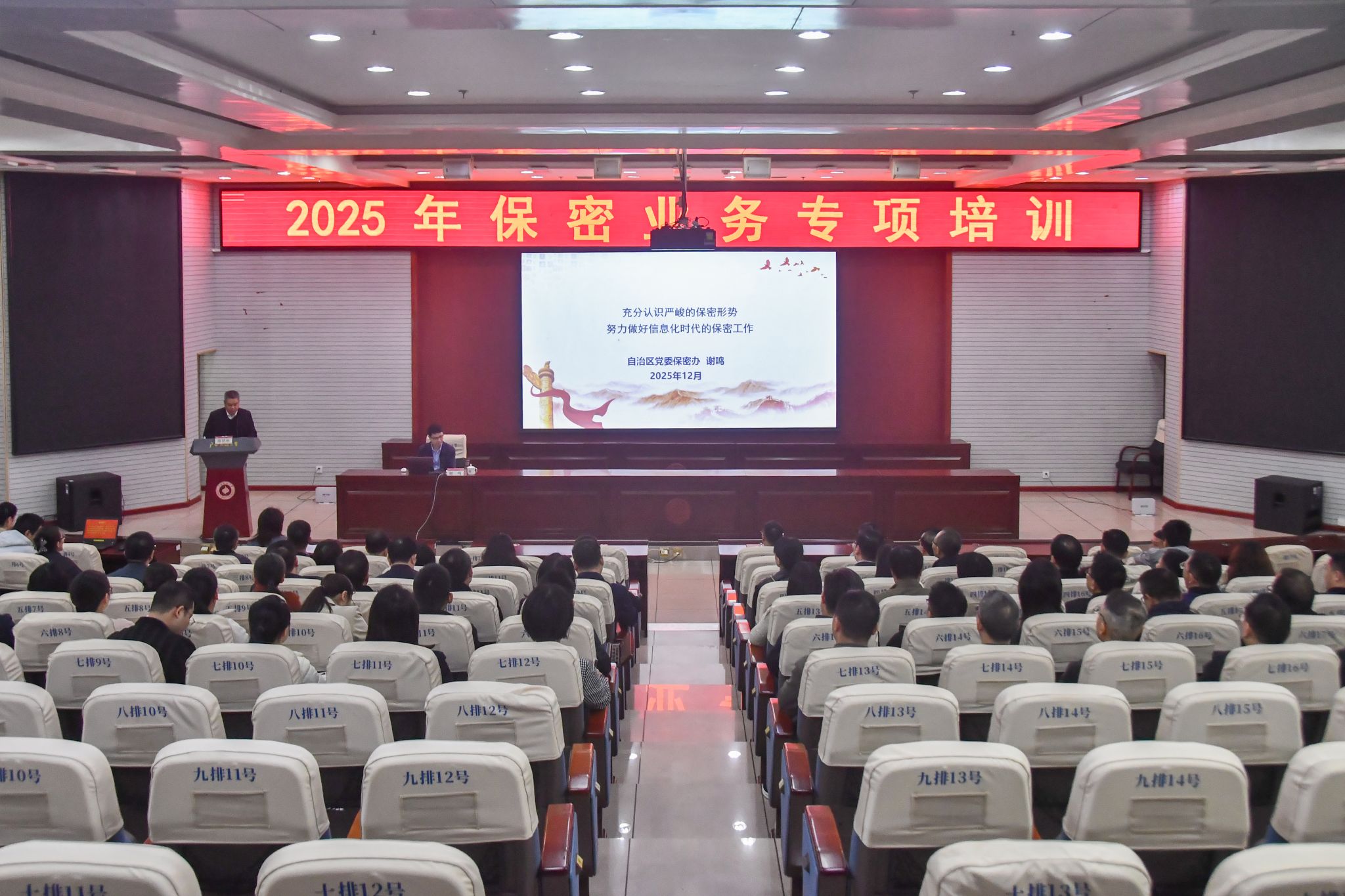 12月4日,校党委副书记陈铭彬出席2025年保密业务专项培训会,自治区党委保密办、自治区国家保密局检查监管处处长谢鸣授课。学校各单位负责人、保密专办员、保密委员会办公室负责人及工作人员参加培训。会上观看《警钟长鸣筑牢防线警示教育片》。(初审/刘银妹 图/刘健鸿 文/刘健鸿 农可盈 编/韦丽娜 实习编辑:樊甲利 复审/韦利坤 终审/孙寿媚)