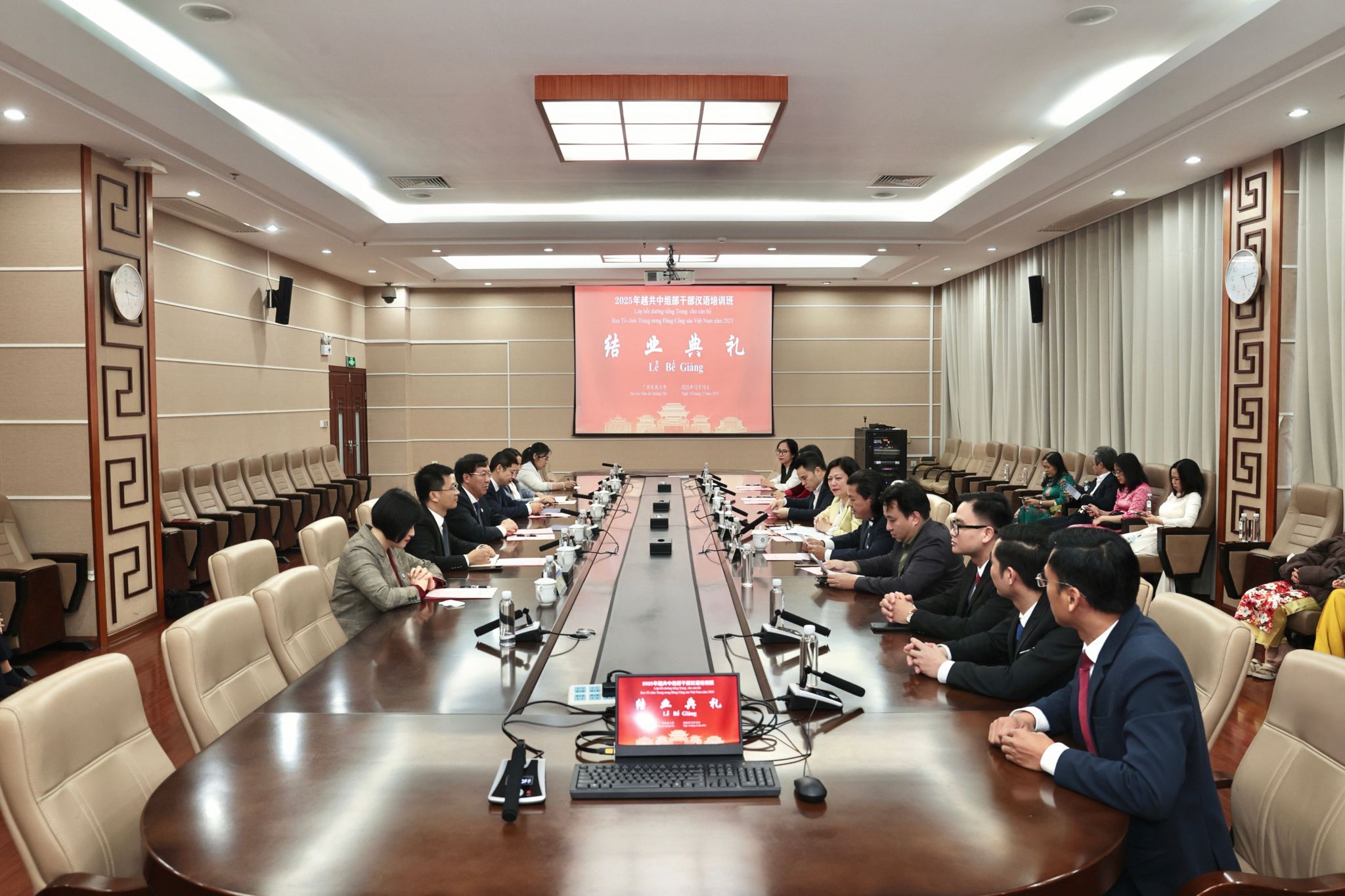 【大学生通讯社报道】12月18日下午,2025年越共中央组织部干部教育培训局干部汉语进修班结业典礼在taptap点点体育国际教育综合大楼会议室举行。越南社会主义共和国驻南宁总领事馆总领事阮氏红、领事范维平,taptap点点体育党委书记唐平秋、党委副书记邓国彬出席典礼。学校有关部门负责人、2025年越共中央组织部干部教育培训局干部汉语进修班全体学员参加典礼。
