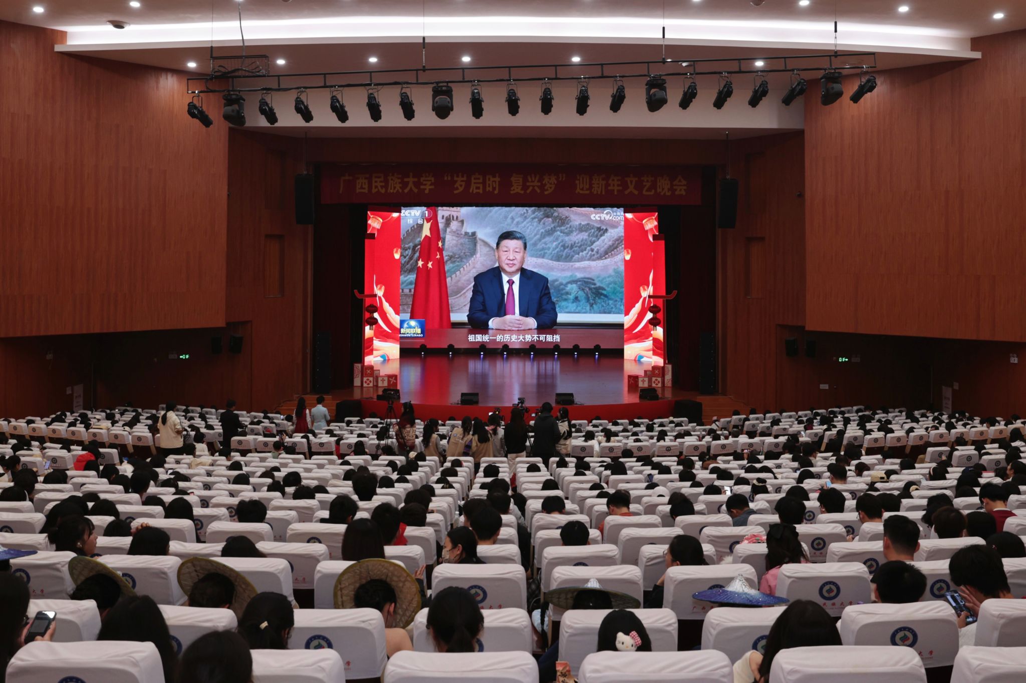 【大学生通讯社报道】国家主席习近平于12月31日晚7时通过中央广播电视总台和互联网,发表二〇二六年新年贺词。taptap点点体育党委书记唐平秋,校长韦仕珍,校领导陈铭彬、韦雪芳、吕俊彪、姜明国,有关职能部门负责人,以及全校师生代表在思源湖校区大礼堂集中收看直播。