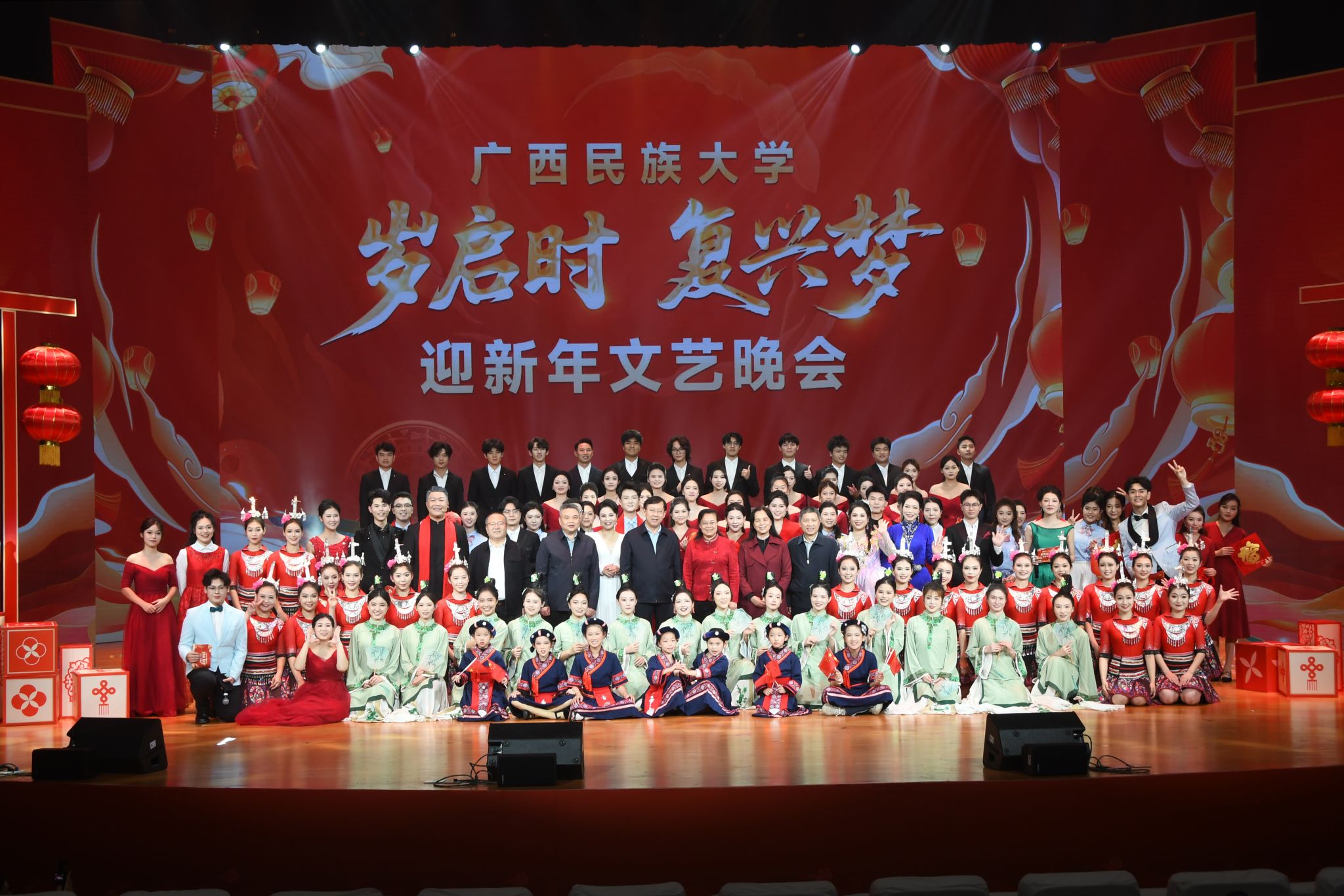 晚会在舞蹈《相亲相爱》中拉开帷幕。学校民乐团带来的大型民族交响乐《春节序曲》展现阖家团圆的温馨、辞旧迎新的欢腾;舞蹈《洗衣歌》和大合唱《保卫黄河》情感真挚、磅礴大气,展现了新时代离退休老同志热爱生活、活力依旧的精神风貌;小组唱《天之琴》以清澈的童声唱响古老传说连通天地的旋律;学校合唱团带来的原生态歌曲《蝴蝶歌》歌声如蝶翼轻振,吟唱着纯净和鸣;舞蹈《赛博未来》以光影编织数字想象,跃动着科技青春的无限可能;歌曲《我是你的朋友》唱响跨越山海的相遇,传递相聚相思湖的温暖情谊;歌曲《写故事的人》以动人旋律,赞颂孜孜不倦的坚守;南宁职业技术大学带来舞蹈《向阳而生》,舞姿昂扬,绽放青春活力;歌曲《山笑水笑人欢乐》在广西艺术学院的演绎中,传递出绿水青山间洋溢的喜悦;大型音诗画《那一抹中国红·伟业》深情表达了对祖国的无限热爱与美好祝愿;最后,全场观众挥舞国旗齐声高唱《歌唱祖国》,晚会圆满落下帷幕。全体参演人员与学校领导合影留念。