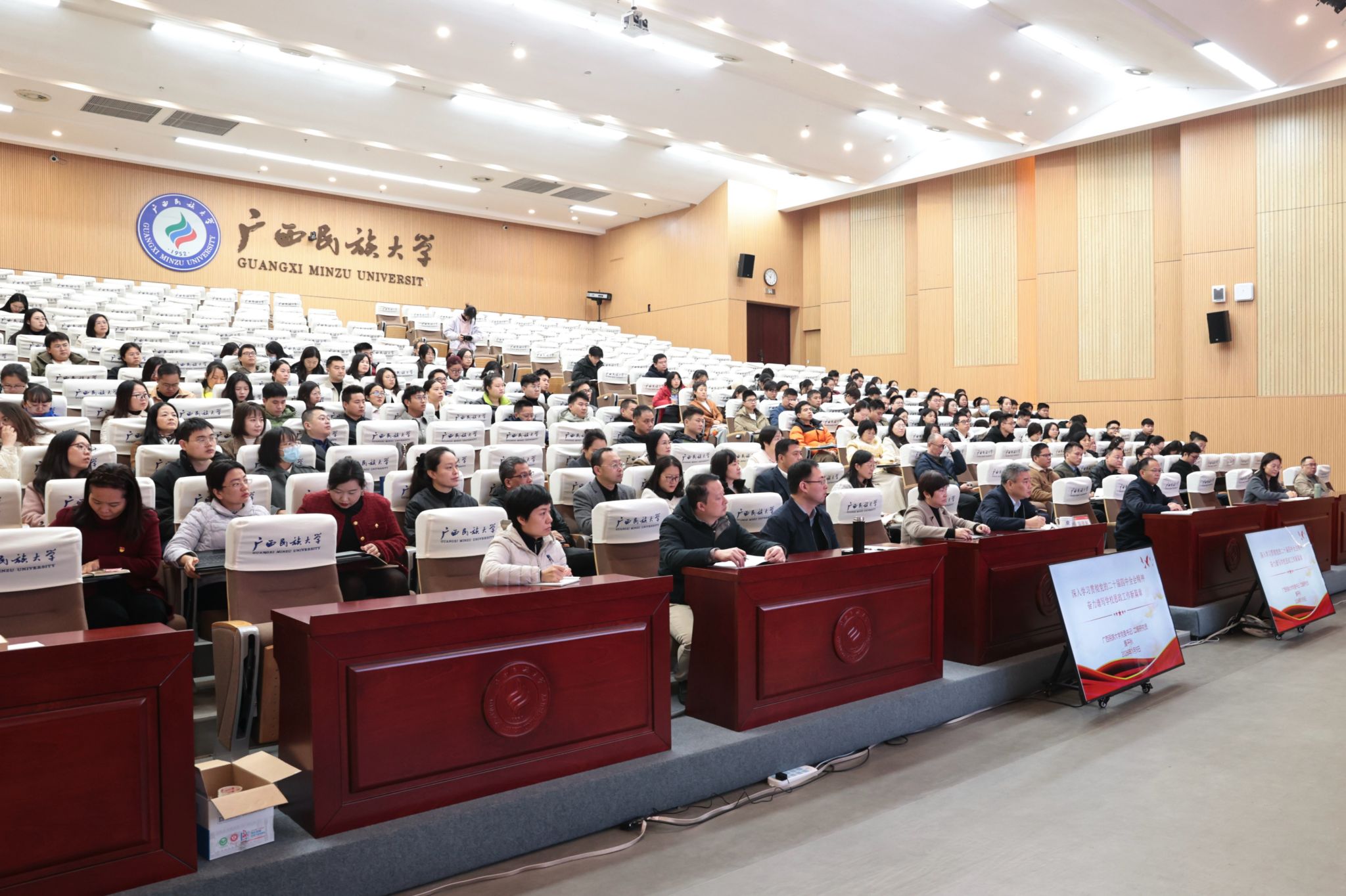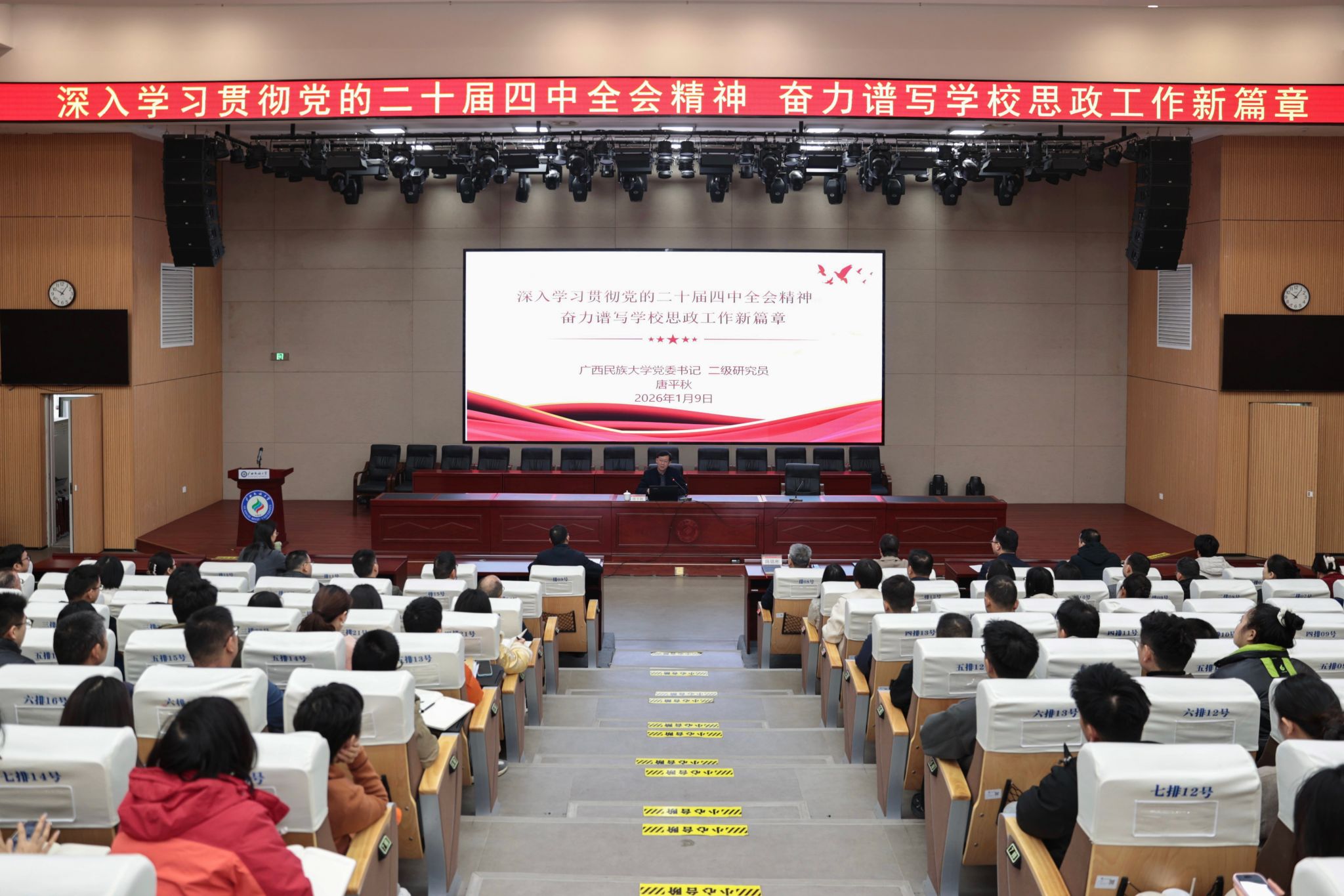 唐平秋强调,要切实把思想和行动统一到党的二十届四中全会精神和自治区党委十二届十一次全会精神上来,将学习成果转化为“十五五”学校思想政治工作的实际成效。要立足学校“民族性、区域性、国际性”办学特色,准确把握发展大势,精准对接区域需求,充分发挥办学优势,深化产教融合,激活人才动能。把铸牢中华民族共同体意识融入思政教育一体化建设,为守护民族团结生命线凝心聚力。紧扣市场需求破解毕业生就业难题,为培养扎根八桂的建设者引路护航。唐平秋结合亲身经历,勉励学校思想政治工作队伍大力弘扬教育家精神,做到政治强、业务精、作风正,把个人成长融入国家发展大局,在建设教育强国、服务新时代壮美广西建设的征程中书写育人答卷。
