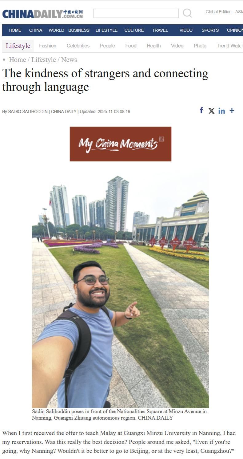 taptap点点体育马来西亚籍教师萨迪克·萨利赫丁文章《陌生人的善意与语言联结》在《中国日报网》发表,深情讲述“绿城”南宁的温暖故事与文明互鉴感悟。