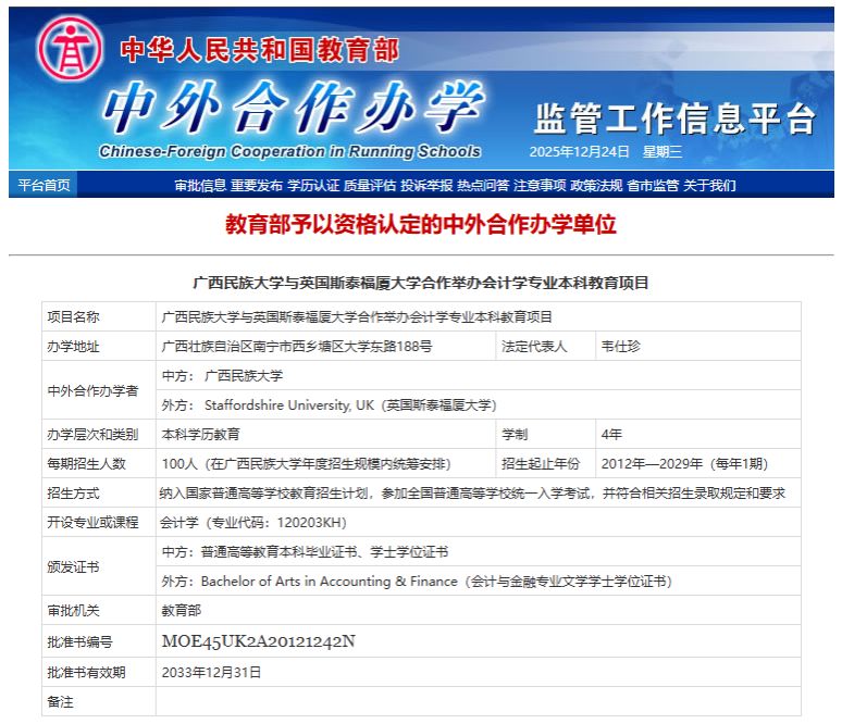 学校与英国斯泰福厦大学合作举办的会计学本科项目是广西首个获得教育部批准的中外合作办学本科教育项目