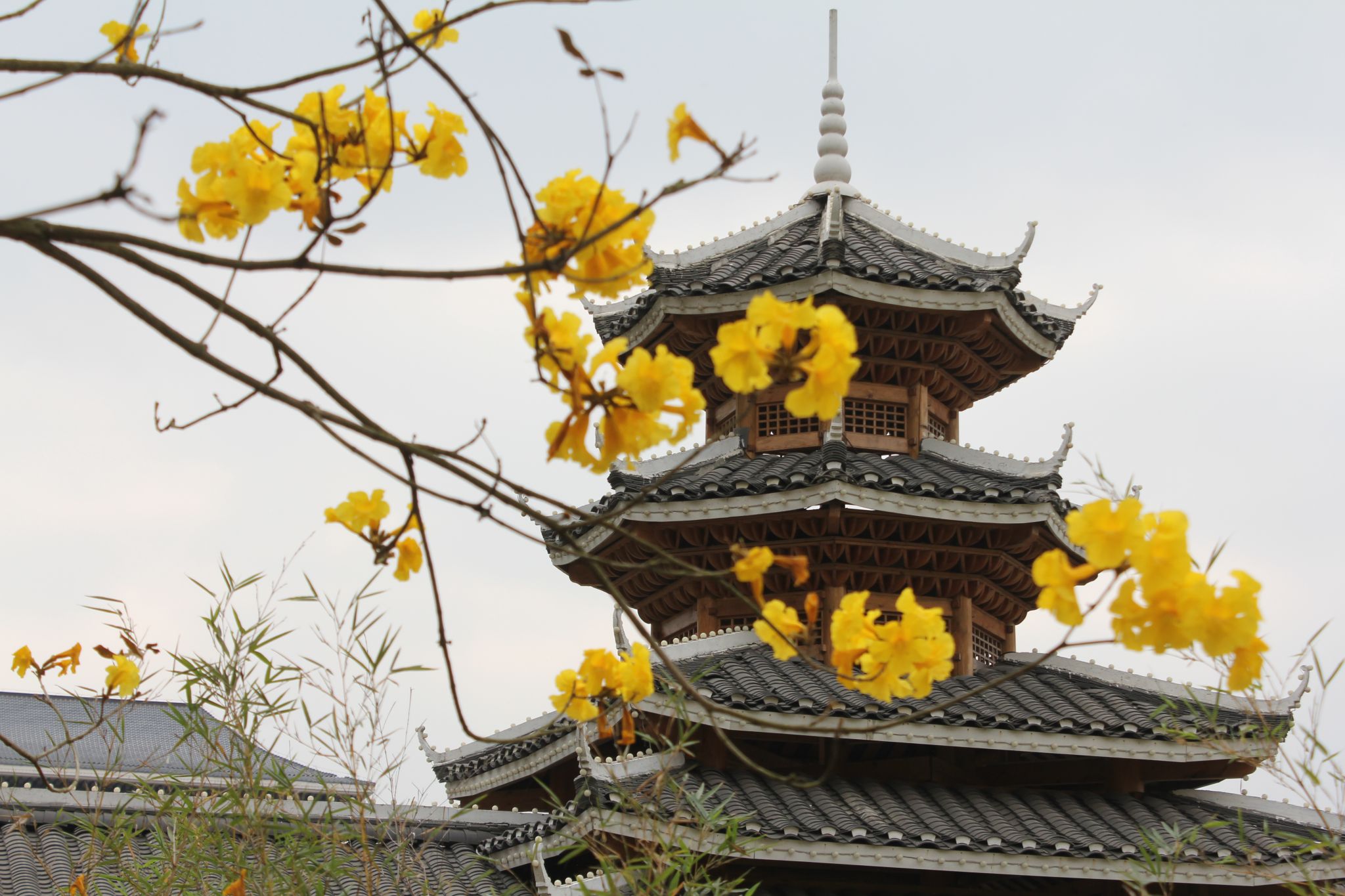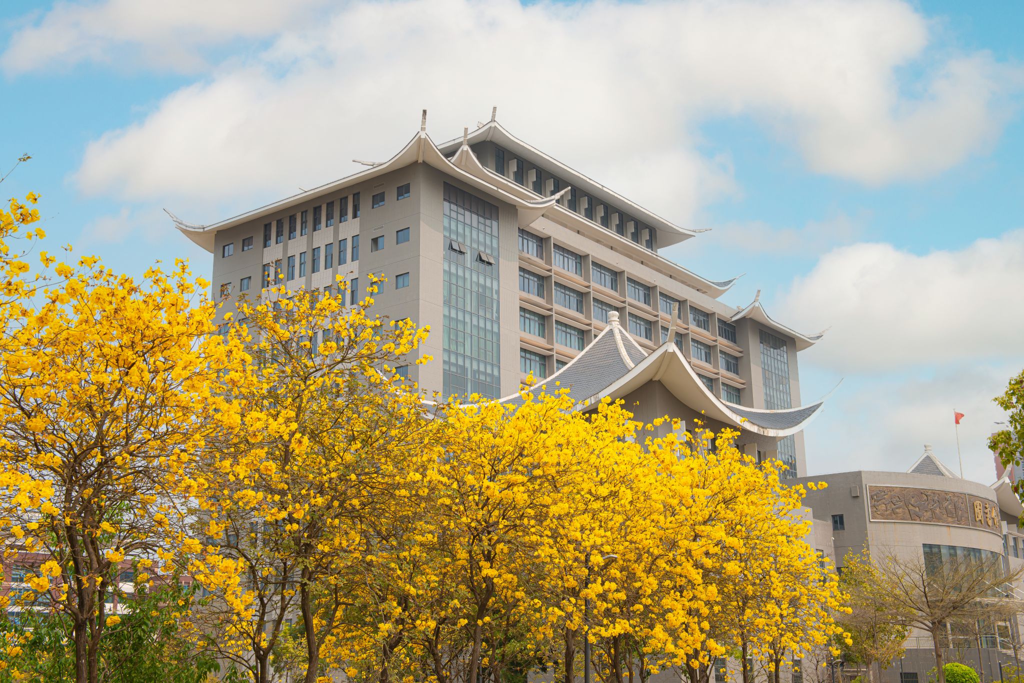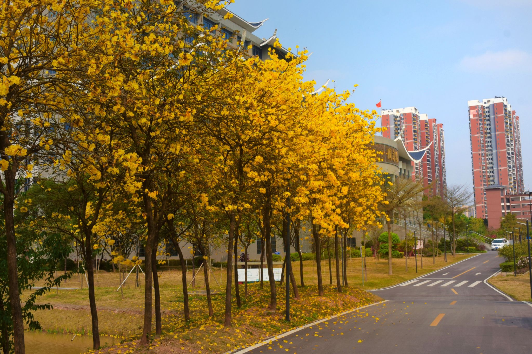“春回气淑响征铙,摇曳多姿挂树梢。”武鸣校区校道旁、未来湖畔、风雨桥边布满黄花风铃木,点缀着校园景色。