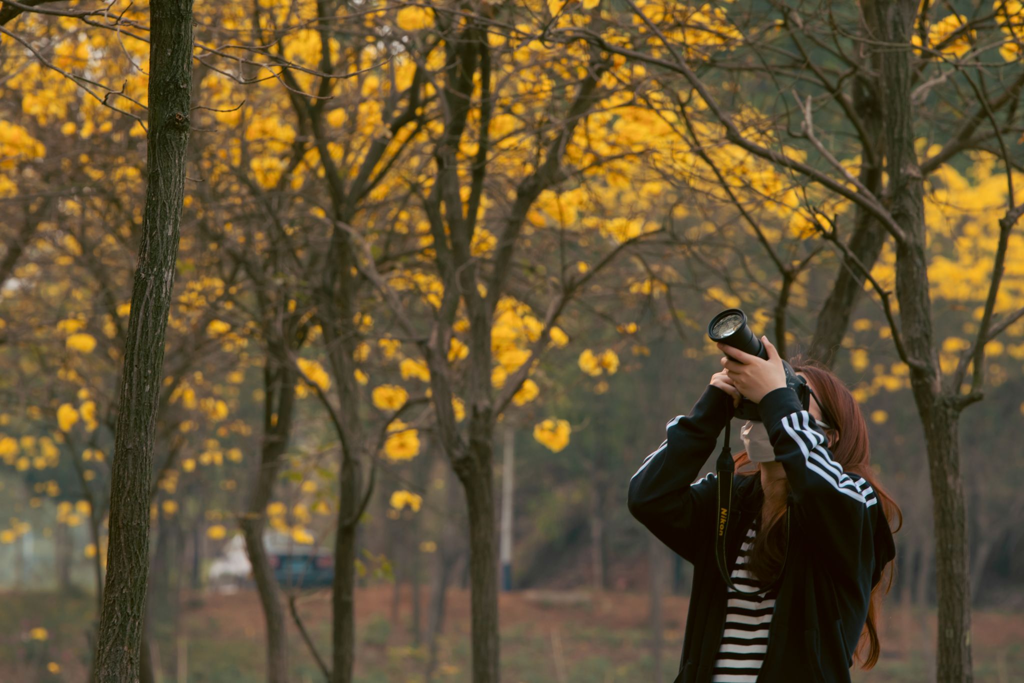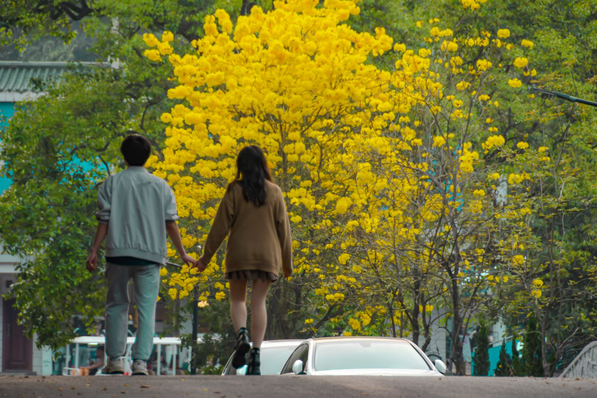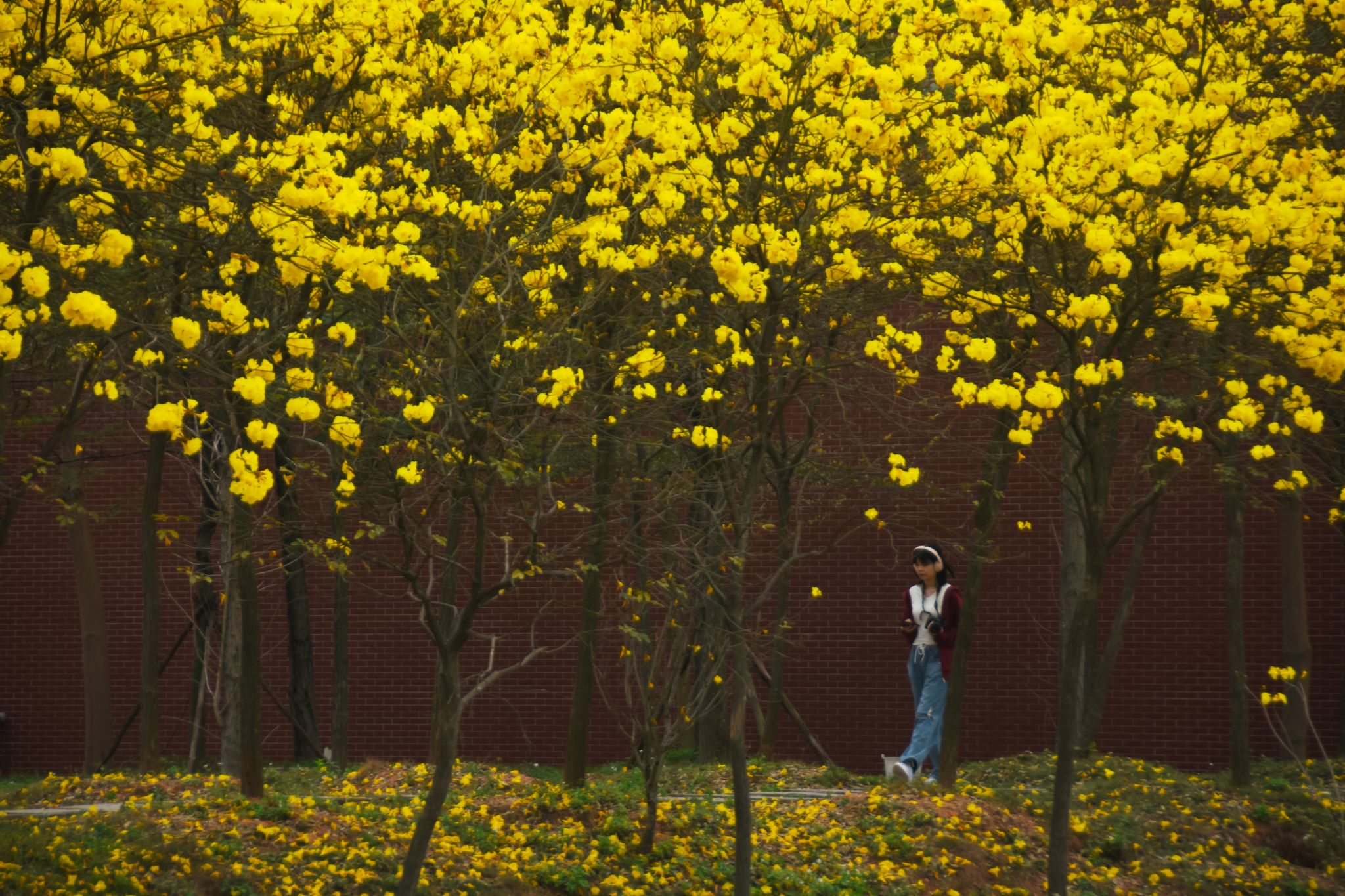 金灿夺目的黄花风铃木映出校园春意盎然,令民大学子驻足、观赏。